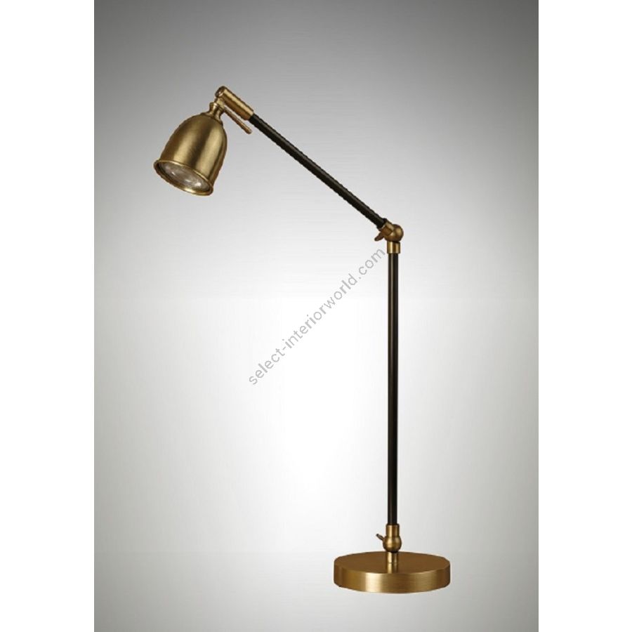 Table lamp in brass. Made with a round tube with a double pivoting arm on a round base, with a pivoting reflector. This elegant table reading lamp gives an efficient direct lighting. Available in black or bicolor (black and matt gold) patina