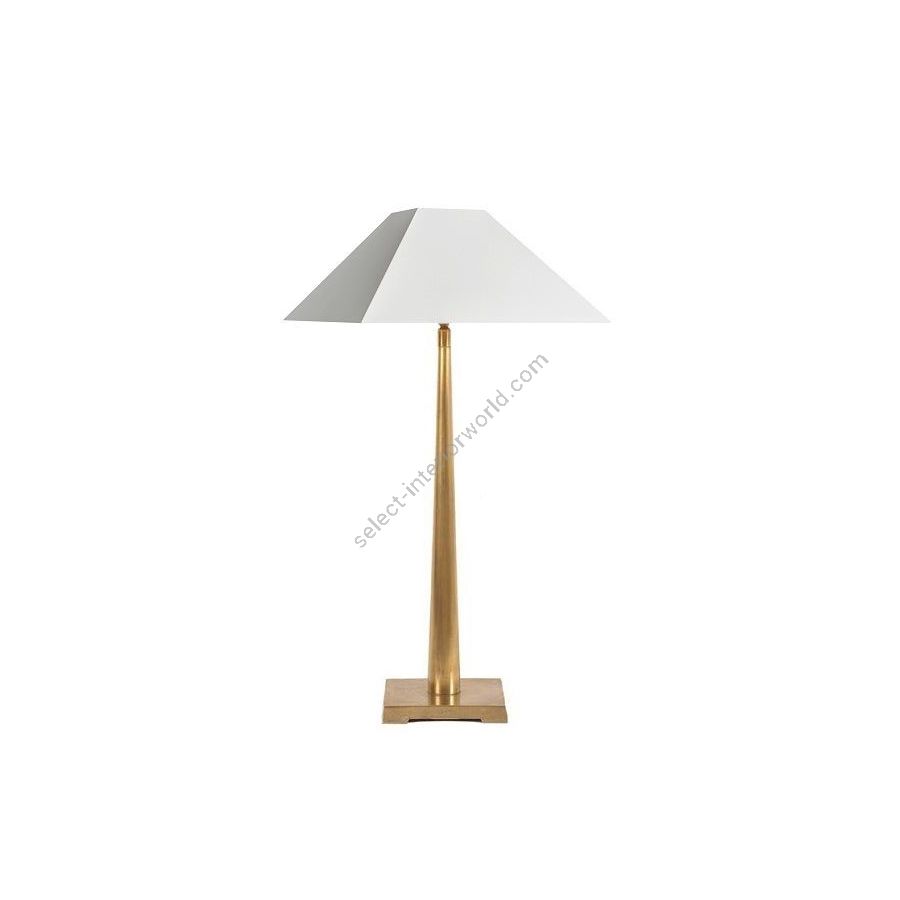 Lamp made in brass. Made with a patered round tube on a square base. This contemporary lamp gives a touch of elegance to your interior. Available in black or matt gold patina, and in nickel. Presented lamp shade in white cotton chintz in a pyramidal tapered (see other available shapes and colours)