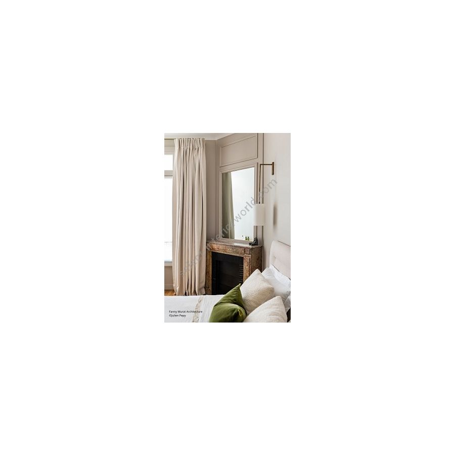 Wall light made in brass. Made with a short vertical tube fixed on a rectangular base, and a vertical tube where the lamp shade is suspended (length of tube and wire can be adjusted on demand). This wall light used next to bed harmoniously decorates a bedroom. Available in black or matt gold patina. Presented lamp shade in white cotton chintz in a cylindrical upright shape (see other available shapes and colours).