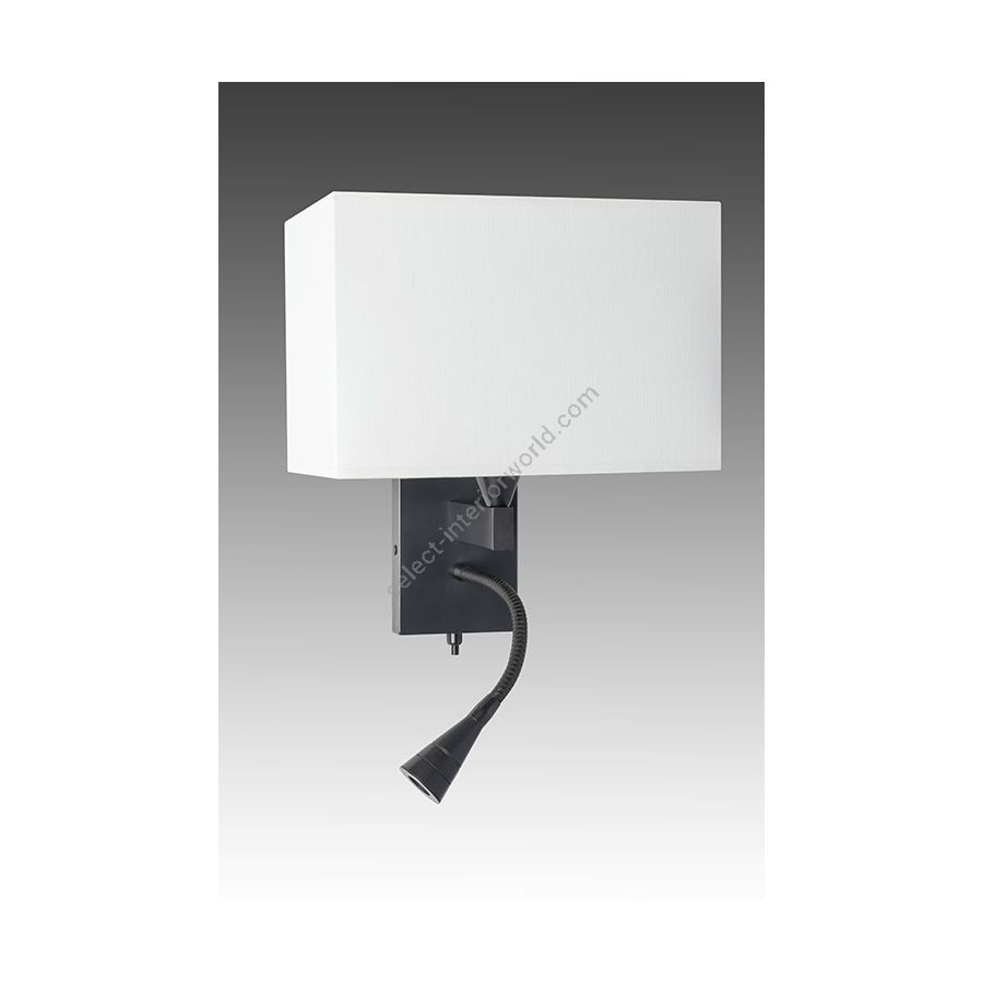 Wall light with Led light made in brass. Made with a fixed arm on a small rectangular base and a Led light, on a 20cm flex with switch. This elegant wall light gives an ambiance or direct light. Possibility of a second switch on demand. Available in black or matt gold patina, and in nickel or brushed nickel. Presented lamp shade in white cotton chintz in a rectangular shape (see other available shapes and colours).