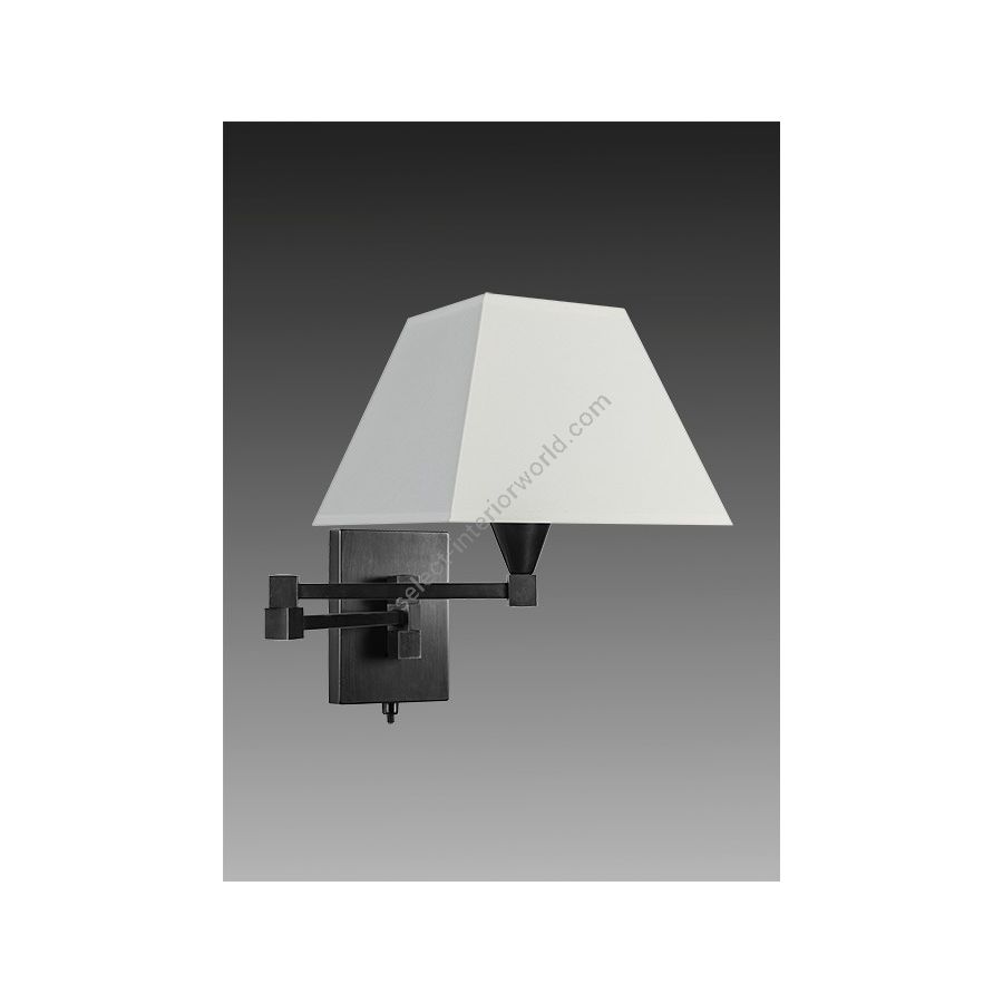 Wall light made in brass. Made with a double swing arm on a rectangular base with switch. This contemporary wall light gives a nice light next to bed. Available in black or matt gold patina. Presented lamp shade in white cotton chintz in a tapered pyramidal shape (see other available shapes and colours).