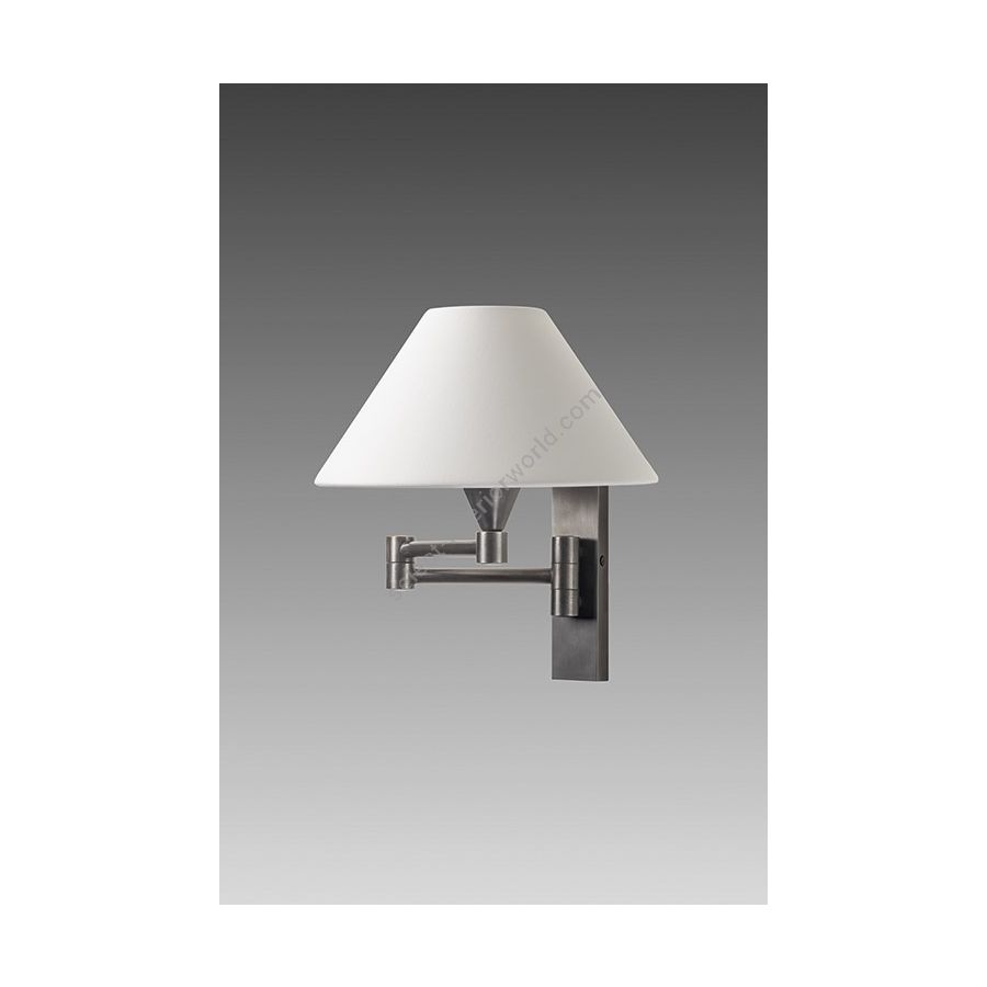 Wall light made in brass. Made with a double swing arm on a rectangular base. This classiacl wall light gives a nice light next to bed. Available in black or matt gold patina, and in nickel or brushed nickel. Presented lamp shade in white cotton chintz in a conical shape (see other available shapes and colours).