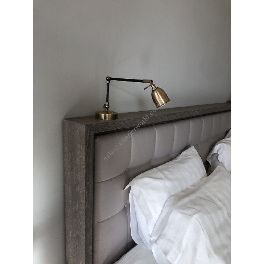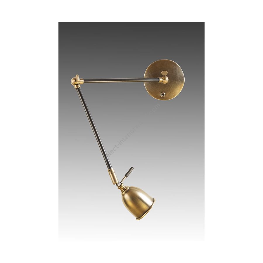 Wall lamp in brass. Made with a round tube with a double pivoting arm on a round base, with a pivoting reflector. This elegant floor reading lamp gives an efficient direct lighting. Available in black or bicolor (black and matt gold) patina.