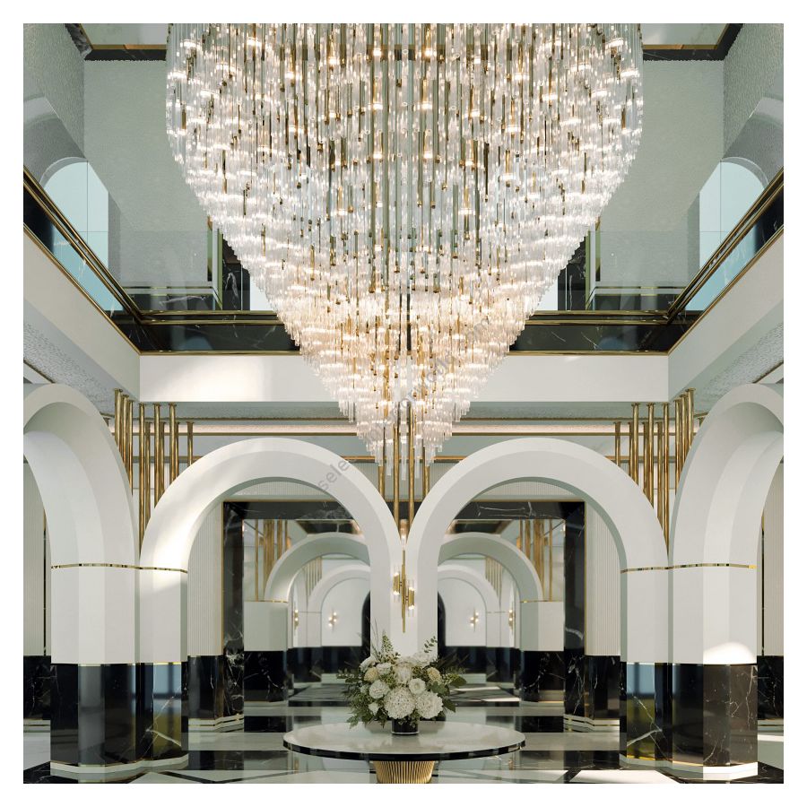 It is recommended for high ceilings and grand spaces, such as hotel lobbies or double floor staircases, being best paired with modern or art deco interior design styles.