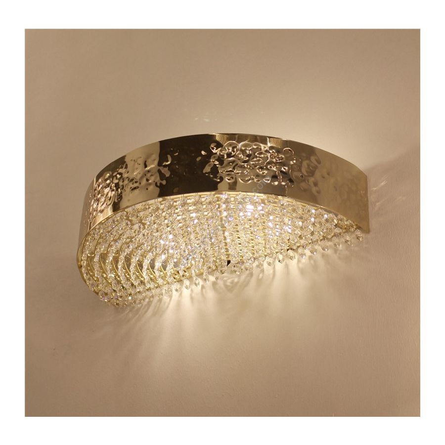 The gold-plated brass structure is hammered by the hands of experienced lighting design artisans as beautiful delicate Crystals are also individually assembled by hand at the bottom of the wall lighting fixture. Let this dashing wall sconce inspire your projects, forging the most exquisite and elegant ambiances.