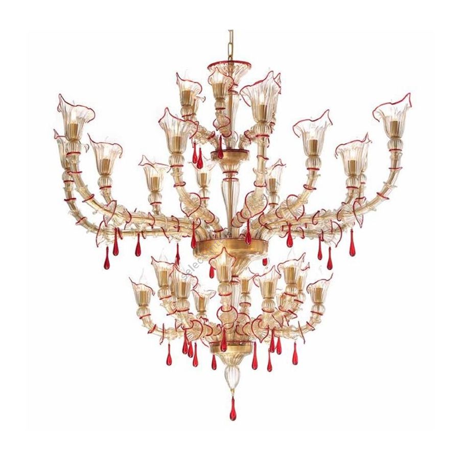 Murano glass chendelier in Ca' Rezzonico style, transparent and gold color, red decorations, the result of high glass craftsmanship. Imposing but light structure that becomes the protagonist of the domestic habitat, defining its style and peculiarity. Lighting item that diffuses the light with great effect in the surrounding environement creating a warm and welcoming atmosphere.