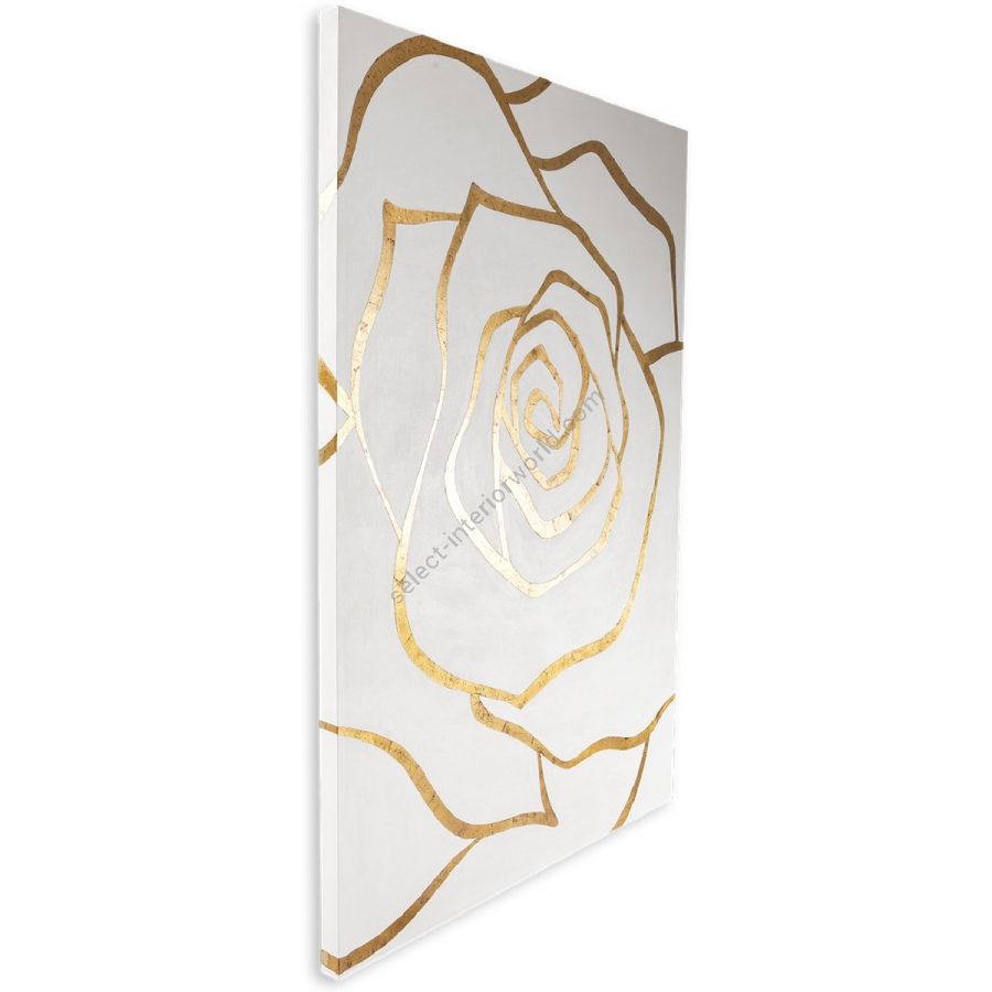 Stunning in its simplicity, and a beautiful addition to any interior, this stylized rose wall art piece is created with gold intarsia expertly handcarved into wood with a french white finish.
