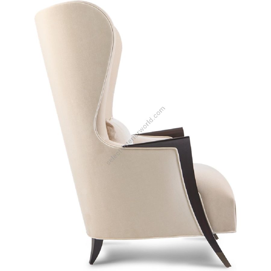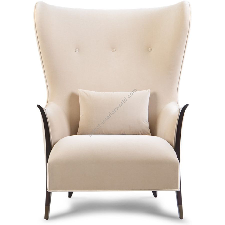 A chic and comfortable occasional chair featuring hand-carved armrests that sweep through the metal finish tipped legs, complemented by a perfectly formed curved winged backrest, enhanced by a row of buttons.
