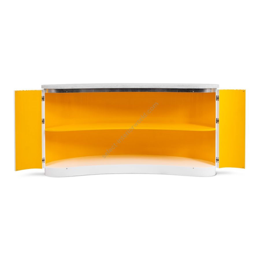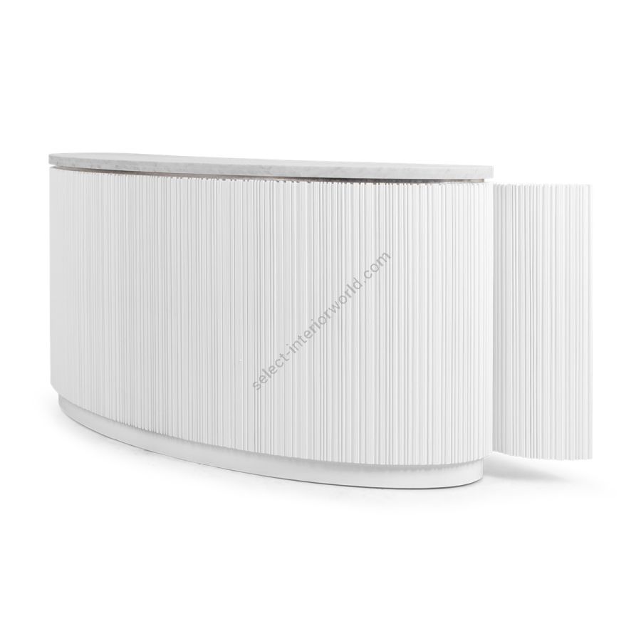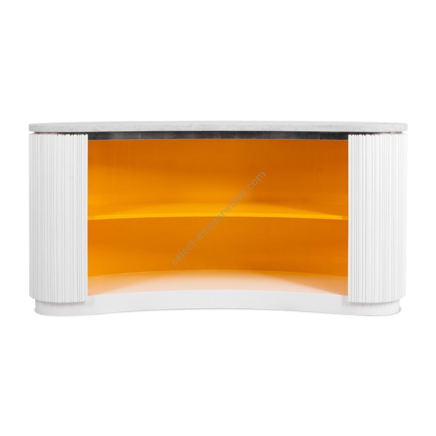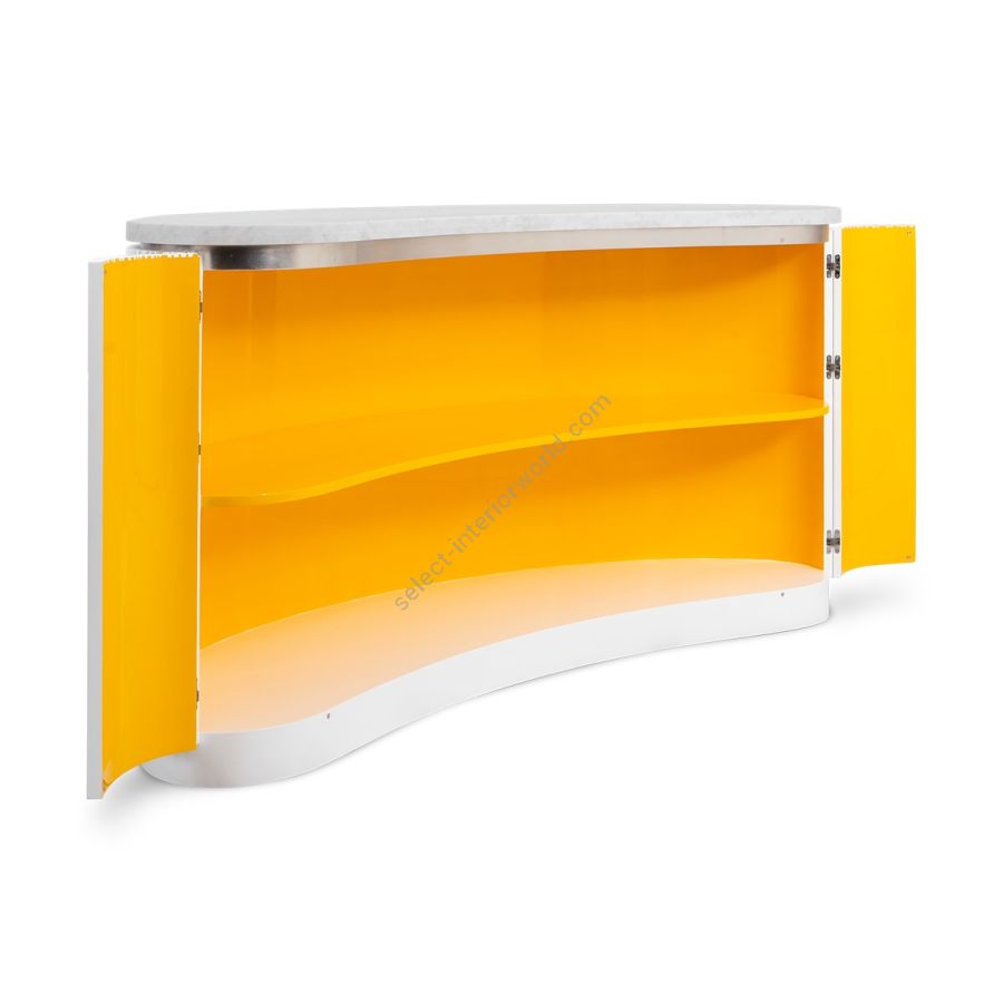 A special edition inspired by Lamborghini, this bar counter features the signature Chez Harrods design with expertly hand-carved ribbed wood. Combining sleek design and refined functionality, it boasts a solid marble top in White Carrara or Nero Marquina and striking Revuelto Giallo finish shelving. Perfect for modern spaces, this piece is a true statement of style and sophistication.