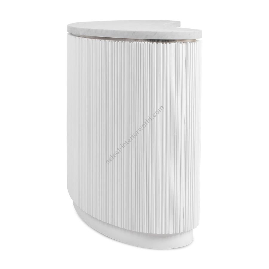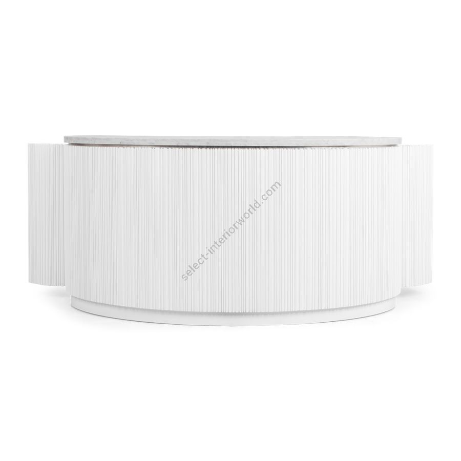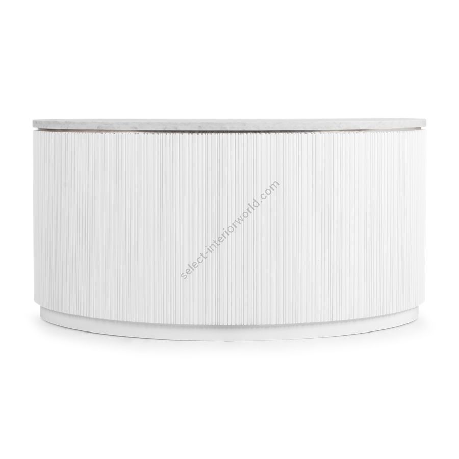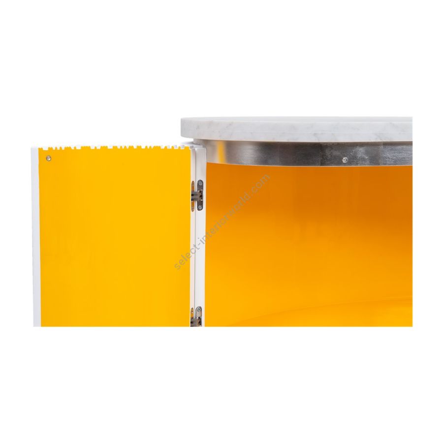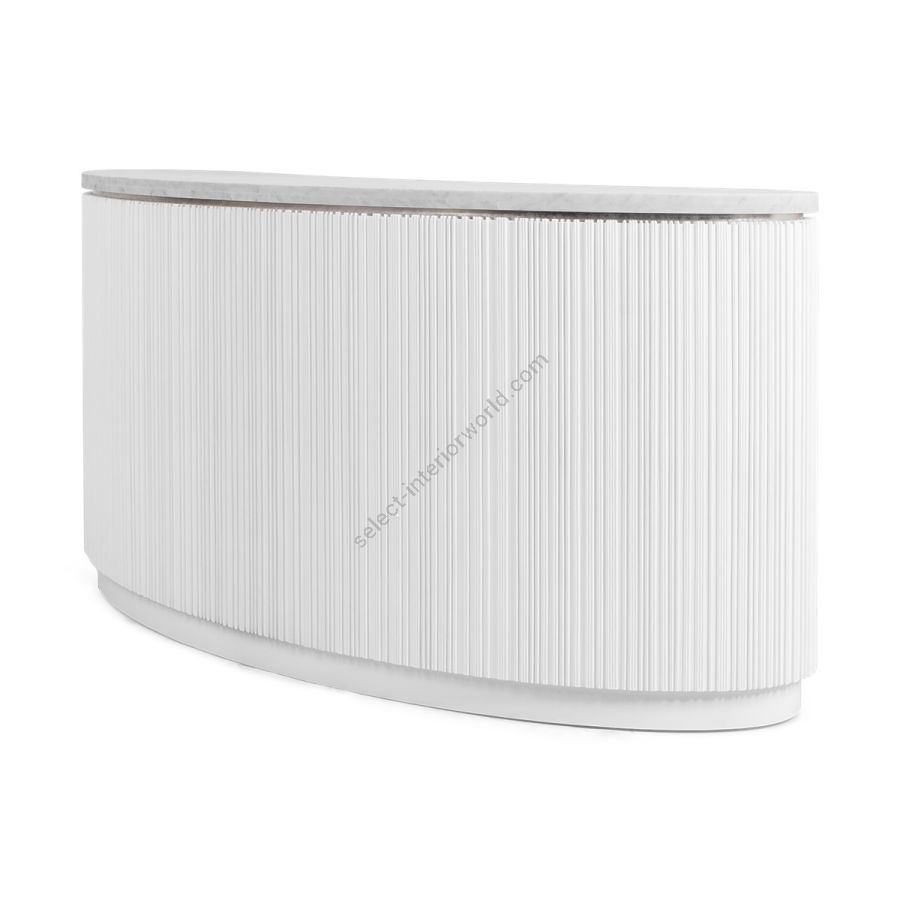 A special edition inspired by Lamborghini, this bar counter features the signature Chez Harrods design with expertly hand-carved ribbed wood. Combining sleek design and refined functionality, it boasts a solid marble top in White Carrara or Nero Marquina and striking Revuelto Giallo finish shelving. Perfect for modern spaces, this piece is a true statement of style and sophistication.