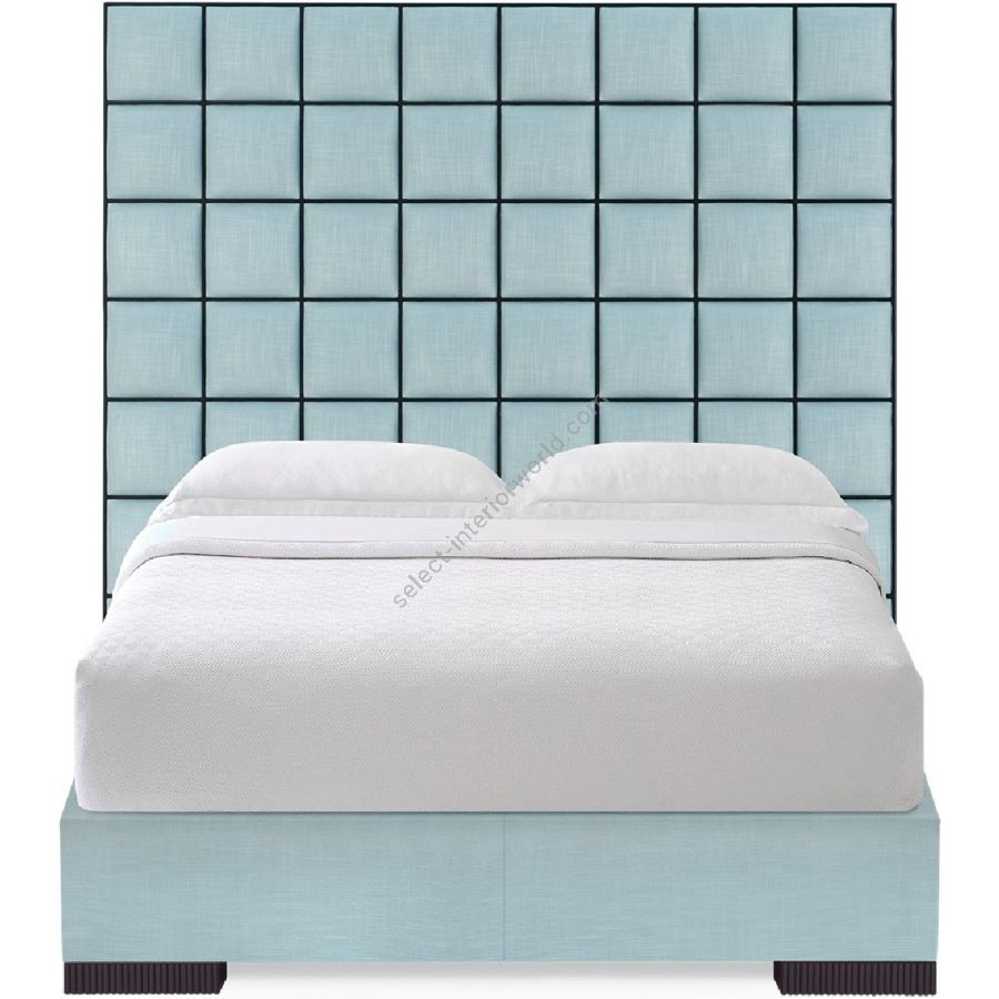 A stunning contemporary bed composed with a grid of 80 upholstered panels, each framed within a mahogany border.