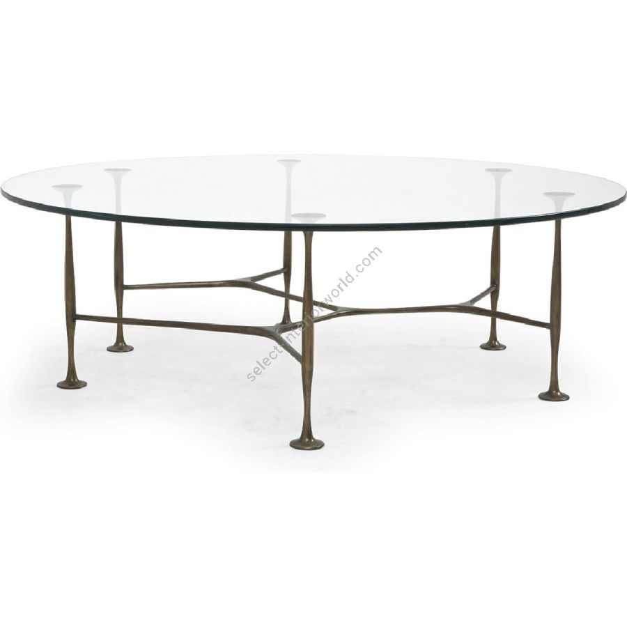 Solid aged brass lower base. Toughened tempered clear glass top. For residential use only. Commercial use is classified as Special Order Design (SOD), and alternative materials may be required. Contact us for details.