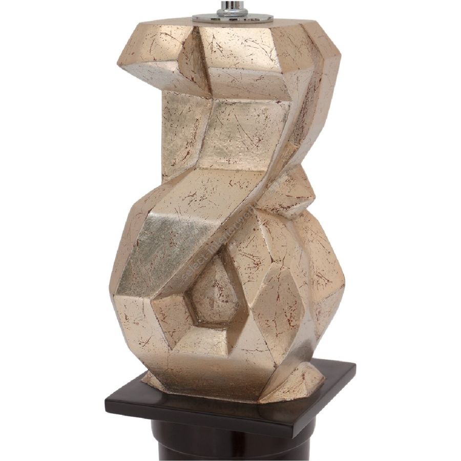 The elegance of the smooth tapering column seemingly floating on a curved square support is complemented by the ingenuity of the hand-carved feature detail in this exceptional floor lamp.