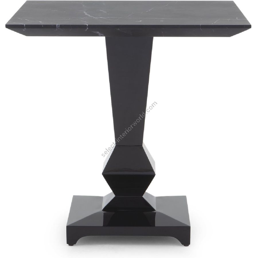 An impactful side table featuring a square top in Marquina marble and a hand-shaped base tapering into an angular square pedestal.