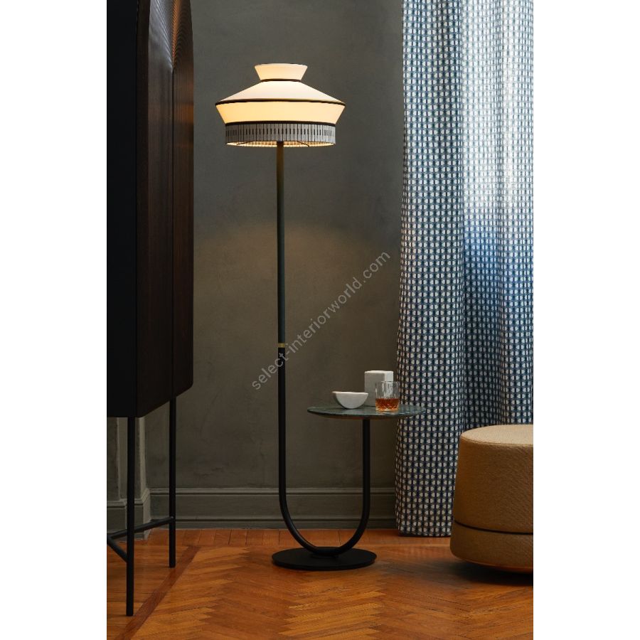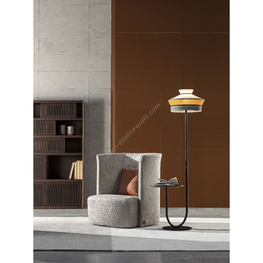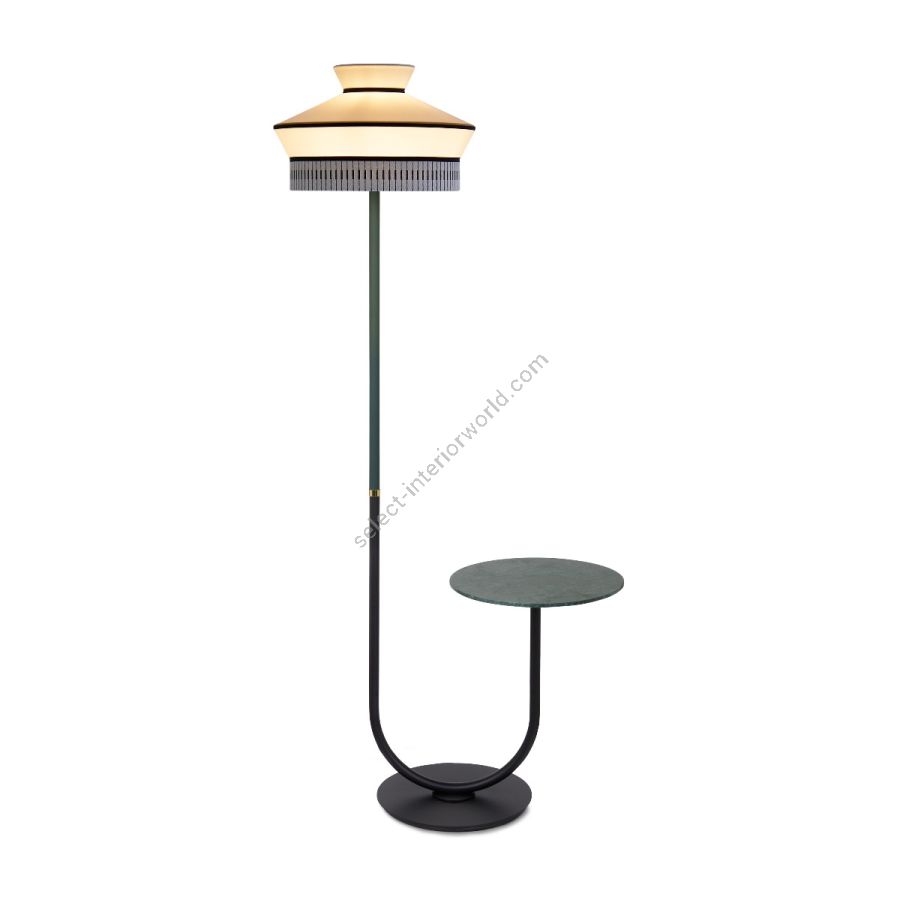 Contardi and Servomuto have decided to add an indoor floor version to the collection, with the option of an attached table. Every lampshade is made of premium waterproof and fireproof fabrics in hypoallergenic and non-toxic materials, while the stem is characterised by black lacquering of the lower part and the base. The upper part is covered in supple leather, and all the parts are unified with brass detailing. The functional yet refined coffee table is made of green Guatemala marble, which harmonises well with the vibrant colours of the lampshades.