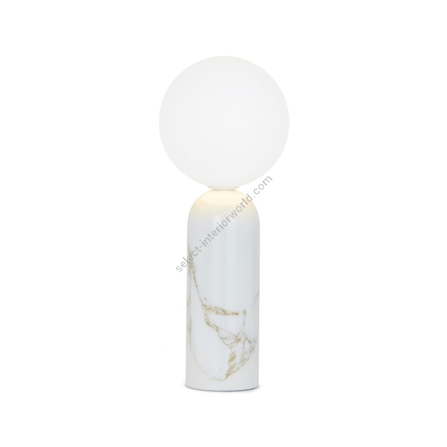 The base in the table version, and the wall and ceiling supports, are made of green Guatemala or white Calacatta marble; the diffuser is a charming white opal sphere that, thanks to its pure essence, spreads the light evenly.