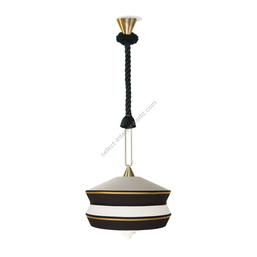 Calypso is a collection of suspension lights inspired by the art deco period, with fabrics whose textures and geometric patterns in black and white mixed with bright colours inspired by the South American and tropical culture, proves a very original result. The indoor version is characterized by a green braided silk cord. The support is a satin brass ring. The diffuser is in transparent glass.