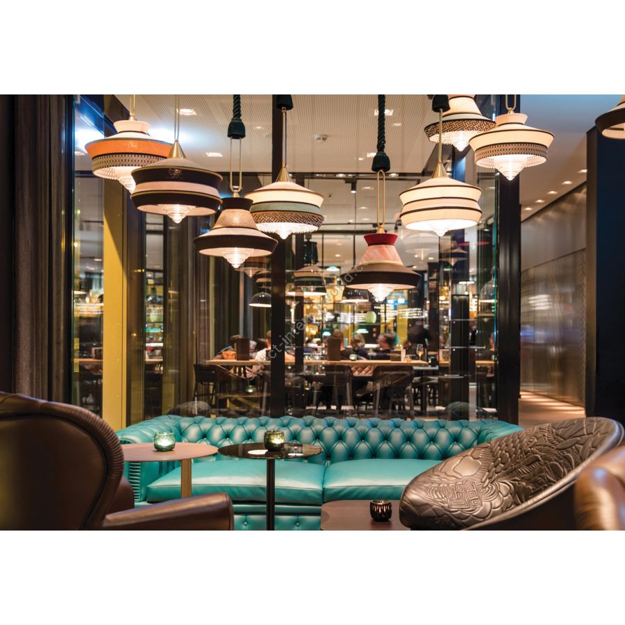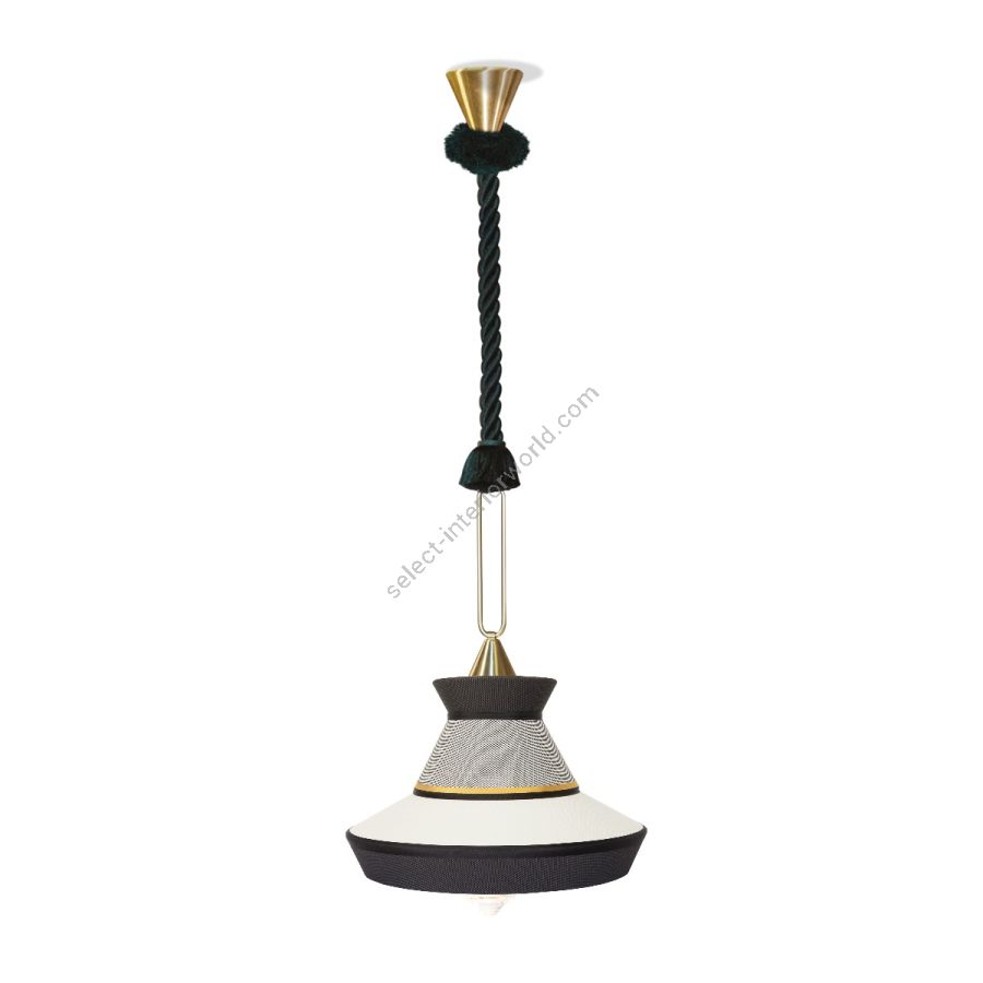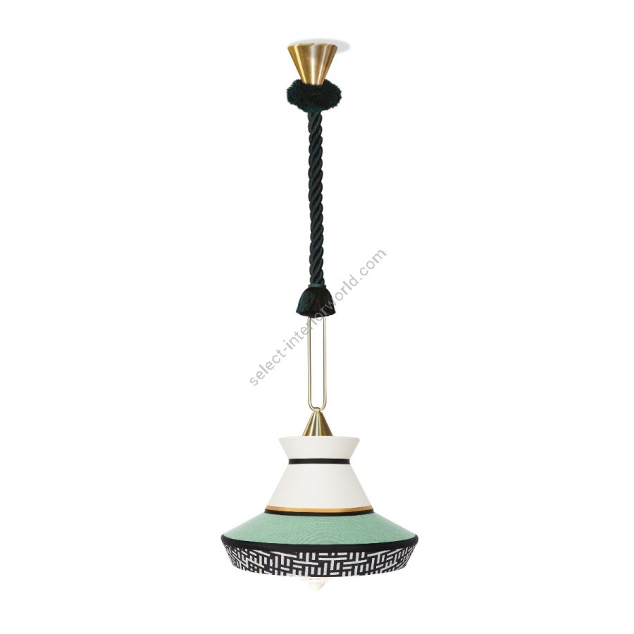 Calypso is a collection of suspension lights inspired by the art deco period, with fabrics whose textures and geometric patterns in black and white mixed with bright colours inspired by the South American and tropical culture, proves a very original result. The indoor version is characterized by a green braided silk cord. The support is a satin brass ring. The diffuser is in transparent glass.