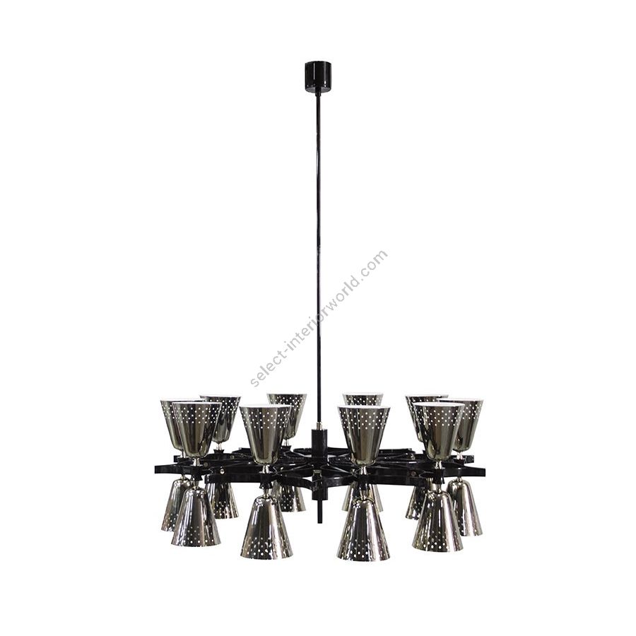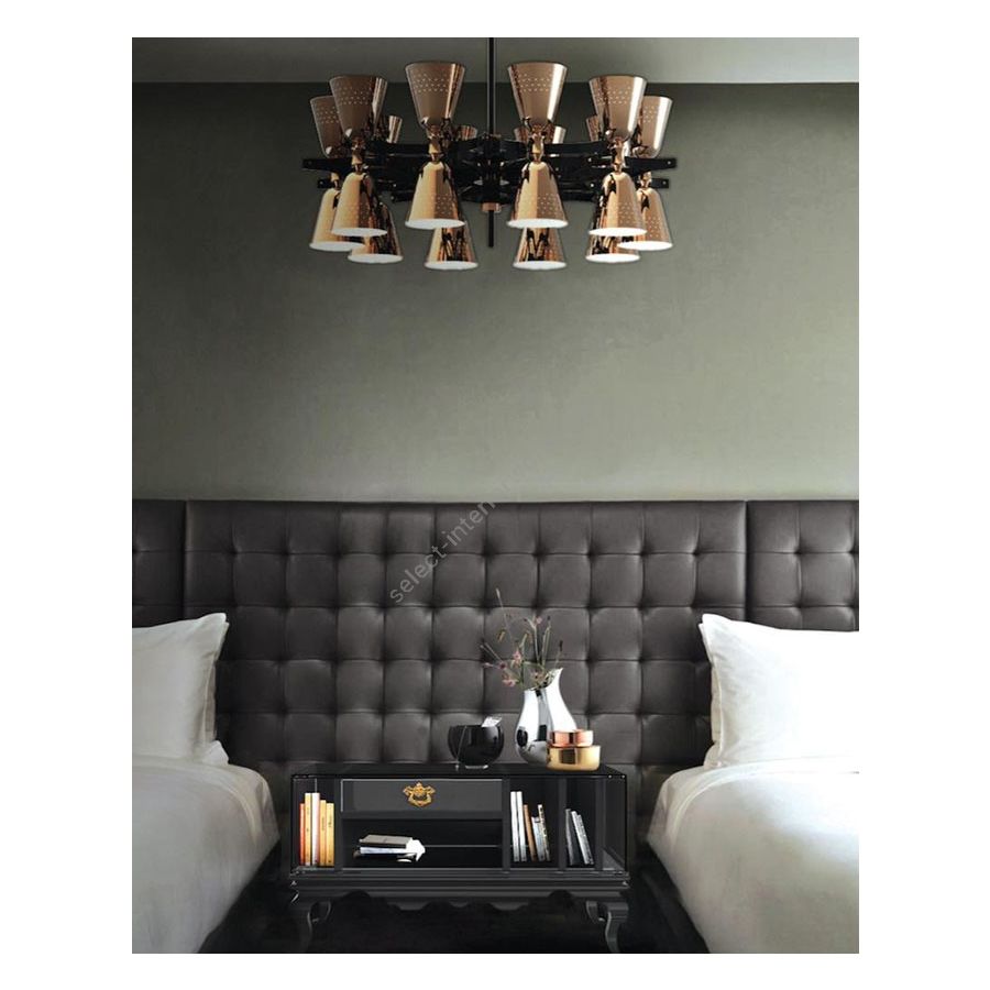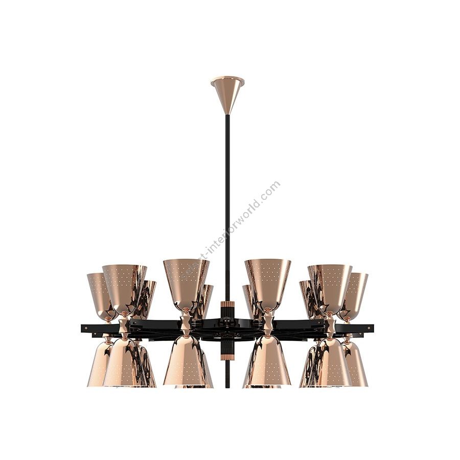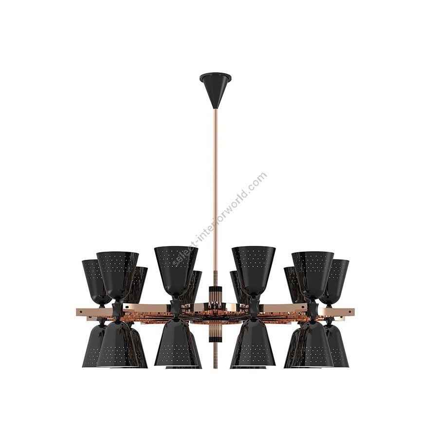 A revival of the mid-century modern design classics, Charles contemporary chandelier is a simple lighting design with a lot of character. It features 20 lampshades, all of them handmade in brass, with perforated details on the top. A copper plated finish is applied to the body of the lamp at the end of the process, creating a more contemporary vibe. The shades are lacquered a glossy black on the outside and a matte white on the inside, helping to create a more cozy light to the human eye. This copper pendant lighting can also be customized to have more shades, according to your needs. The right contemporary pendant light for a Scandinavian dining room, or a modern living room design.