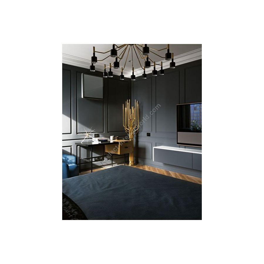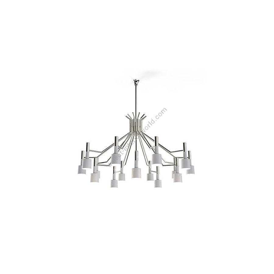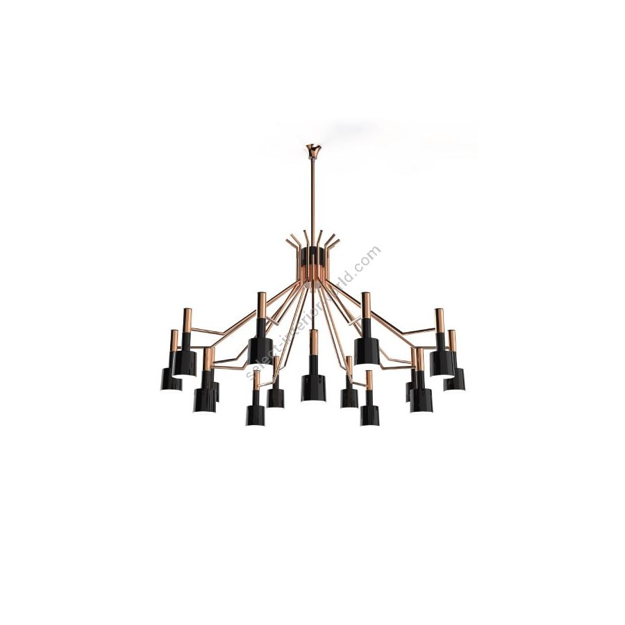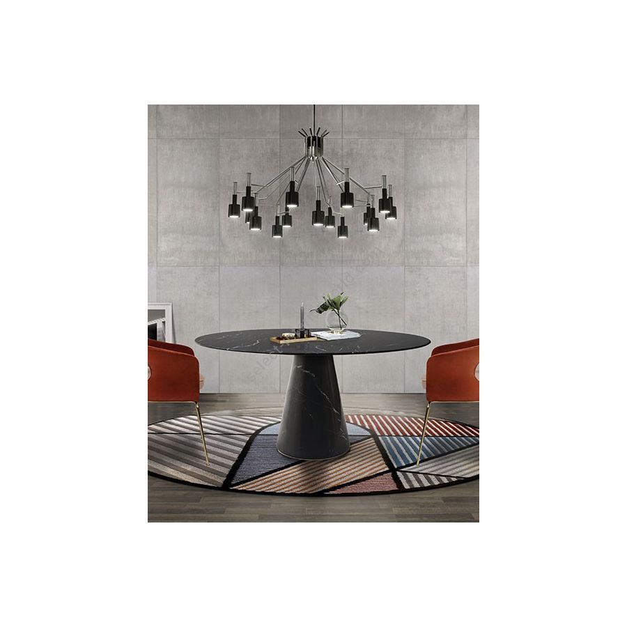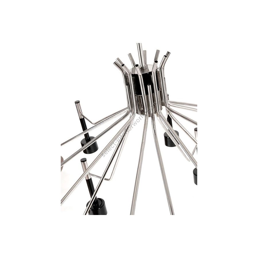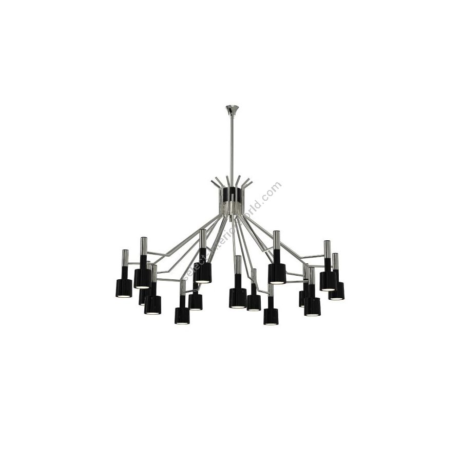 Ella round chandelier is a unique ceiling fixture which brings back the clean and sophisticated feelings of the mid-century modern era lived in the 1960’s Palm Springs. With a body 100% handmade in brass and its lampshades made of aluminum, this lighting design was reinvented using today’s technical skills paired with the traditional craftsmanship and know-how of some of the best portuguese artisans. The body has a nickel plated finish, while the lampshades are lacquered a glossy black for a sleeker look. It is available both in the 6 or 15 arms versions. An iconic mid-century modern chandelier, perfect for a contemporary living room or dining area.