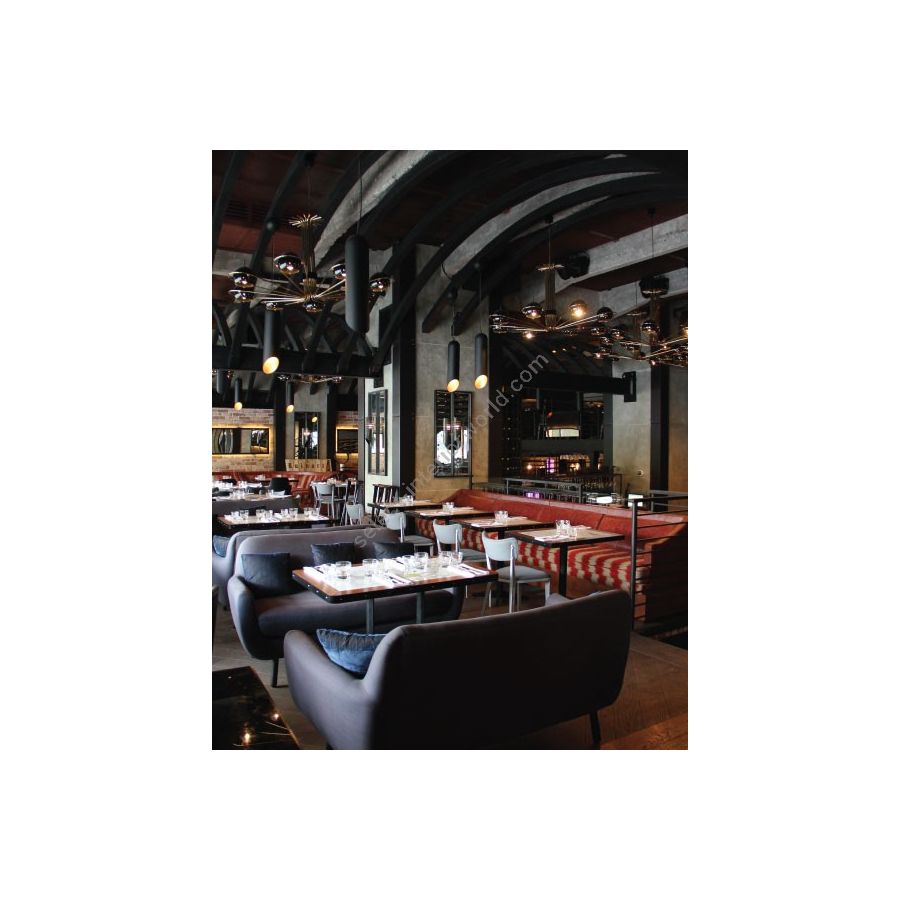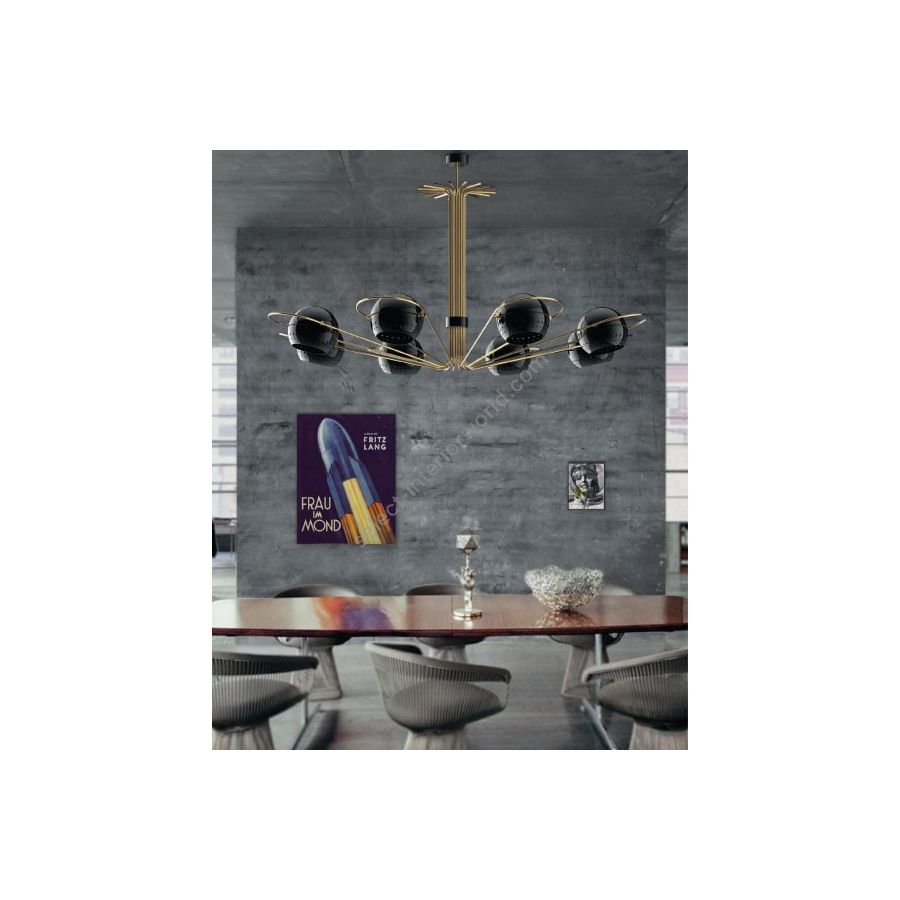 Neil is a modern chandelier with round arcs and spherical diffusers, that were inspired by the golden years of space exploration in the 60’s. It has 8 arms with rotating spheres to cast light to wherever you need in order to create the perfect mood - a rare feature on chandeliers. Therefore, this iron chandelier casts ambient light in all directions. It also offers the choice of having only 4 of the 8 diffusers lit on. With a structure handmade in iron and 8 lamp shades in iron, Neil black chandelier has a mid-century modern design with glossy black exterior and a matte black interior finishing. Ideal as a modern dining room lighting or as a centerpiece in your mid-century living room, Neil will add an innovative touch to your interior design.
