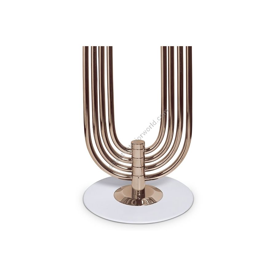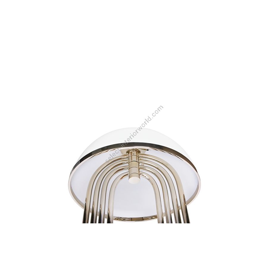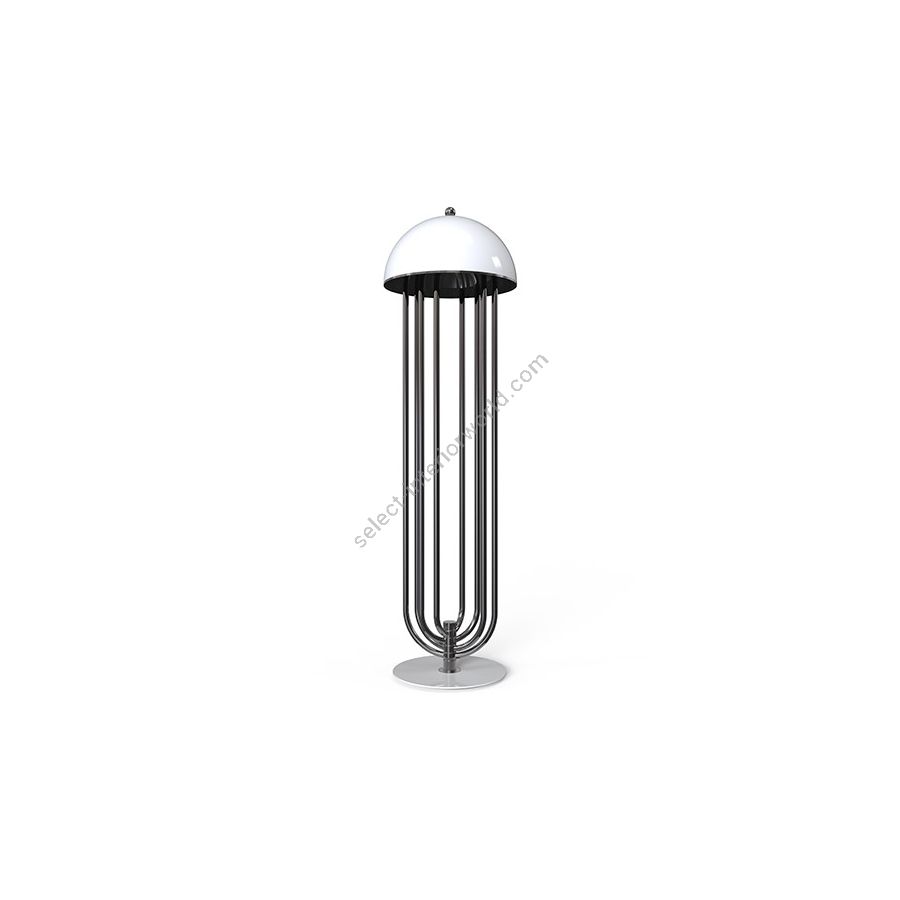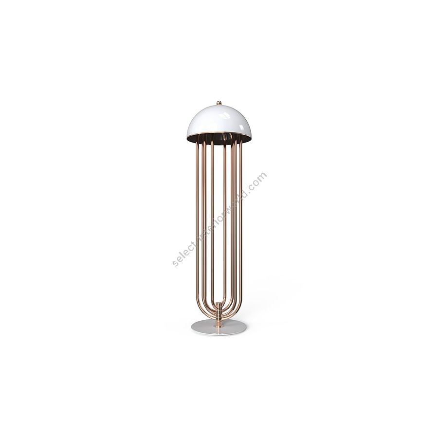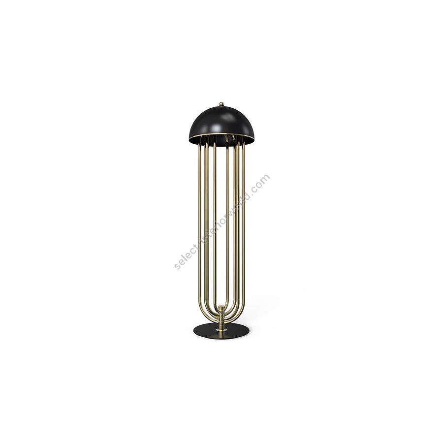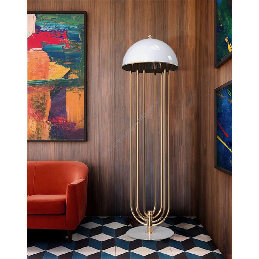 Turner floor lamp was inspired by Tina Turner’s electrifying dance moves. Ideal for any hotel design project, this art deco floor lamp will fit perfectly in a modern lobby entrance or next to a mid-century lounge chair. This mid-century floor lamp has four large arcs made in brass and a semi-spherical top cover of aluminum lacquered in glossy white or any other RAL color of your choosing. With the possibility of rotating its arcs into the desired position, Turner floor light is perfect for anyone looking for a practical lighting design with a cutting edge design. All in all, this modern corner lamp allows you to create your favorite composition at any time, elevating your mid-century modern decor.