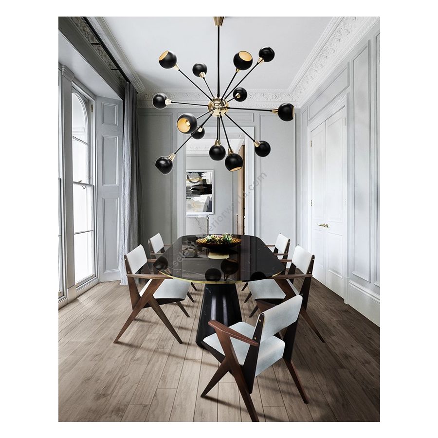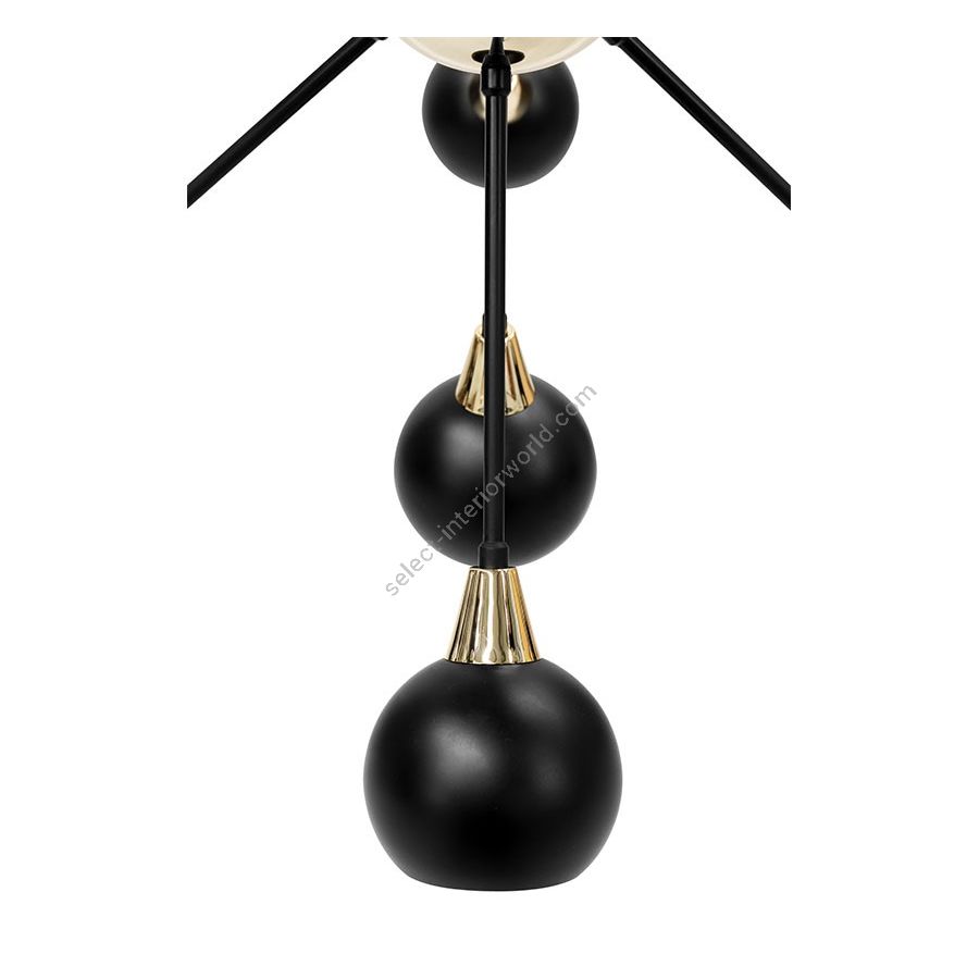 Blakey is a hanging lamp, which mirrors the era and modern art. It has a symbiosis between a strong presence to highlight a space, and the simplicity of the shapes, and their proportions adjusted to the reality of our day. It is presented in its standard version with a matte black structure, with shades and the central sphere highlighted in gold, an option given to give greater elegance.