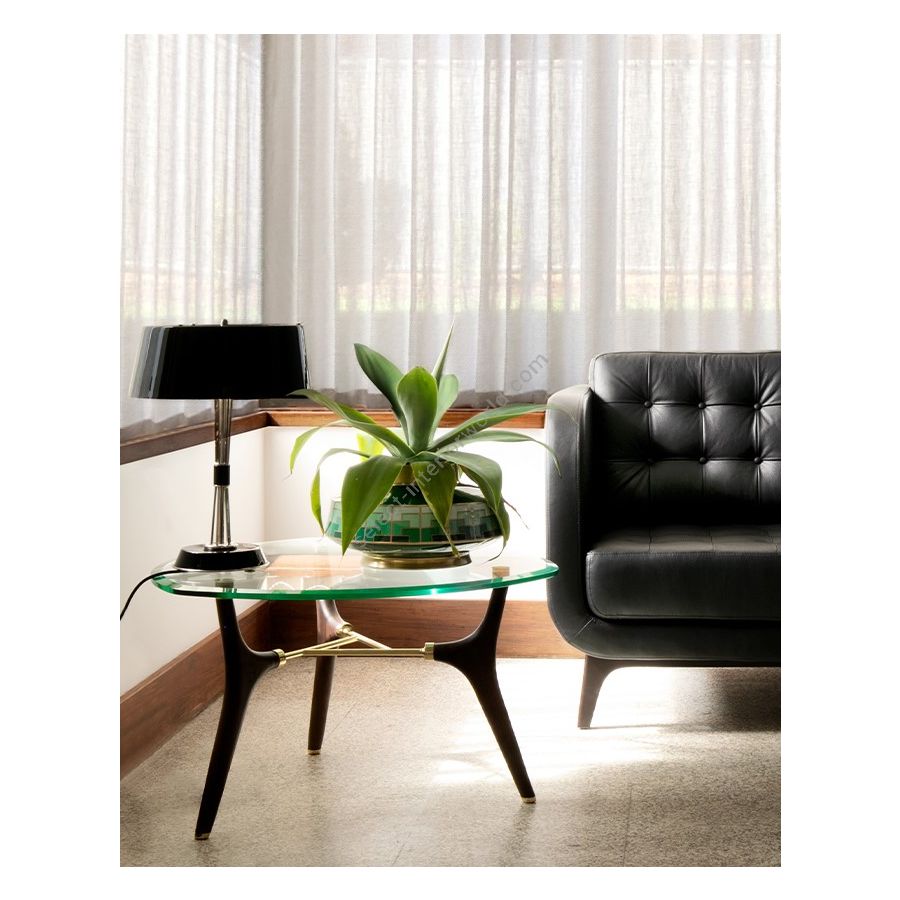 Miles table lamp is a classic mid-century modern table lamp, which brings back the sophisticated atmosphere of the 50s. It is handmade in brass, with an aluminum shade. The body has a copper plated finish for a more contemporary look, while the shade is lacquered a matte black on the outside and a white matte on the inside. It is essentially a copper table lamp that casts a soft glaze that will suit your modern entryway in the most flattering way. It also looks stunning when put on display as an office lamp, so don’t be afraid to try and use it as a sophisticated study table lamp.