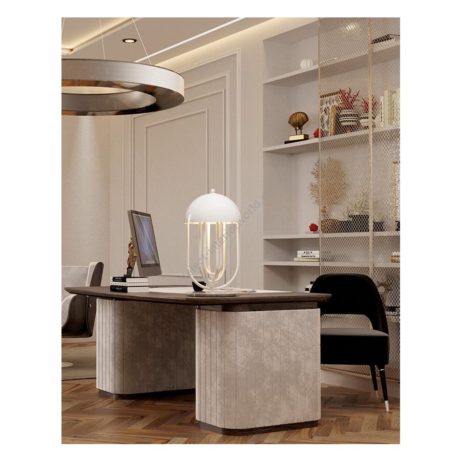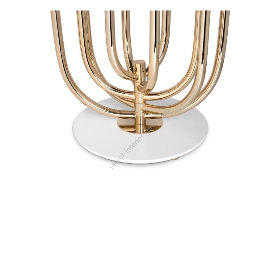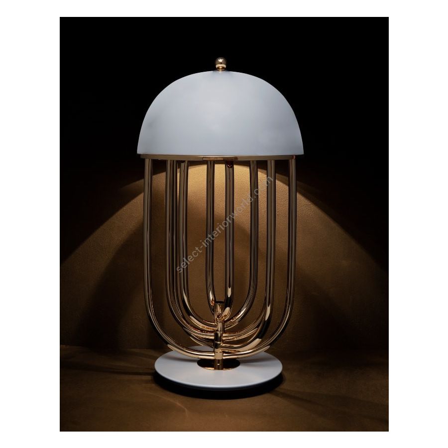 Turner art deco table lamp was inspired by the electrifying and memorable dance moves of the iconic pop singer. Turner is a large table lamp handmade in brass and aluminum. The body has a gold plated finish, while the shade was lacquered a black matte on the outside and a gold powder paint on the inside, so as not to create an uncomfortable glaze for the user. Its five movable arcs can be rotated into the desired position, which gives this black table lamp a sense of fun, and allows you to create the best composition to fit your modern home decor. A versatile piece, that can be used in almost any room of your house, this brass desk lamp looks its best when placed in a modern home office or art deco inspired living room.