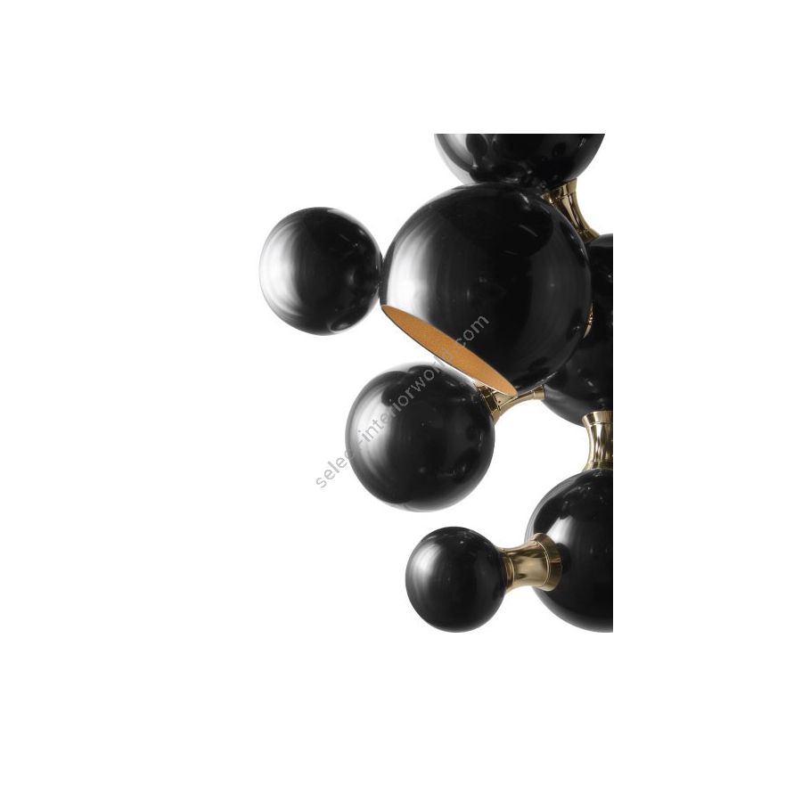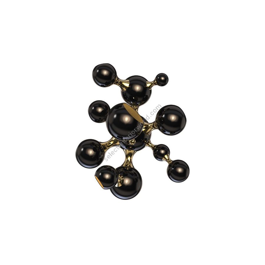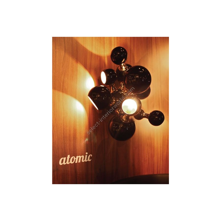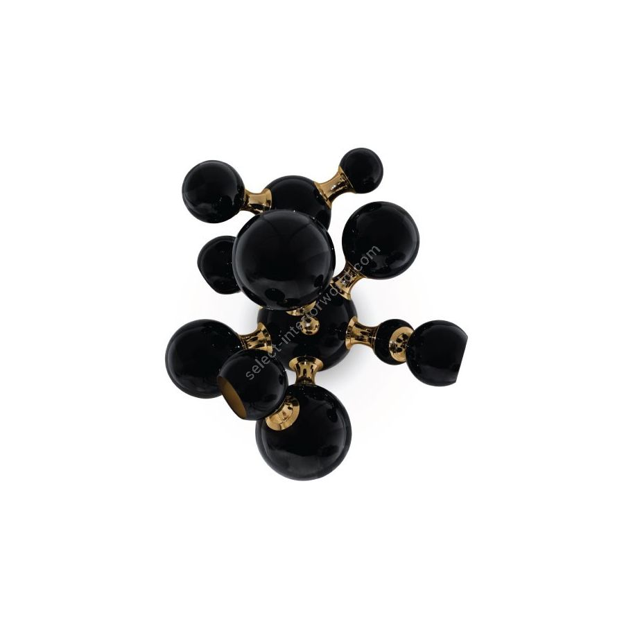Atomic wall light is a mid-century modern lighting design inspired by the atomic discoveries of the mid-20th century. With multiple round shades that resemble the molecular composition of the atom, this interior wall light can give a fun twist to a contemporary home decor. Its body is handmade in brass and steel, with both a glossy black and a gold-plated finish. The lamp shades feature a glossy black lacquer on the exterior, while gold powder paint is used for the interior shade. It is with a modern vibe that this indoor wall light creates a statement of mid-century modern design in a contemporary living room, displaying each detail as a faithful reproduction of the glamorous 1950s.