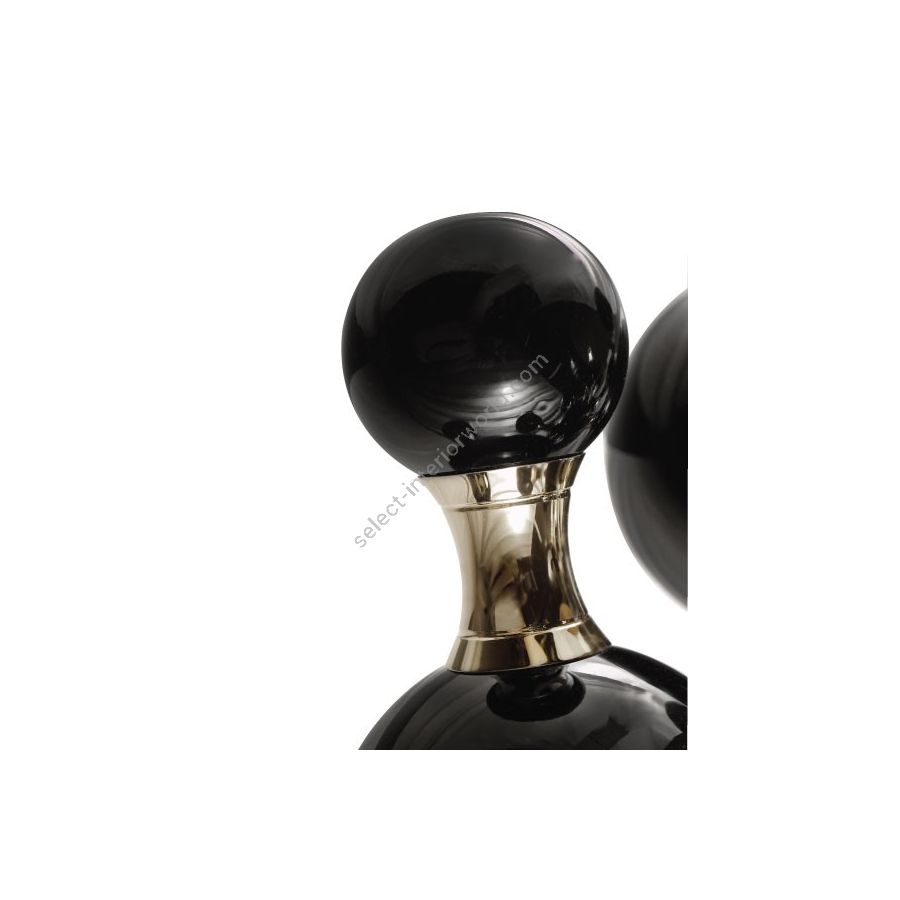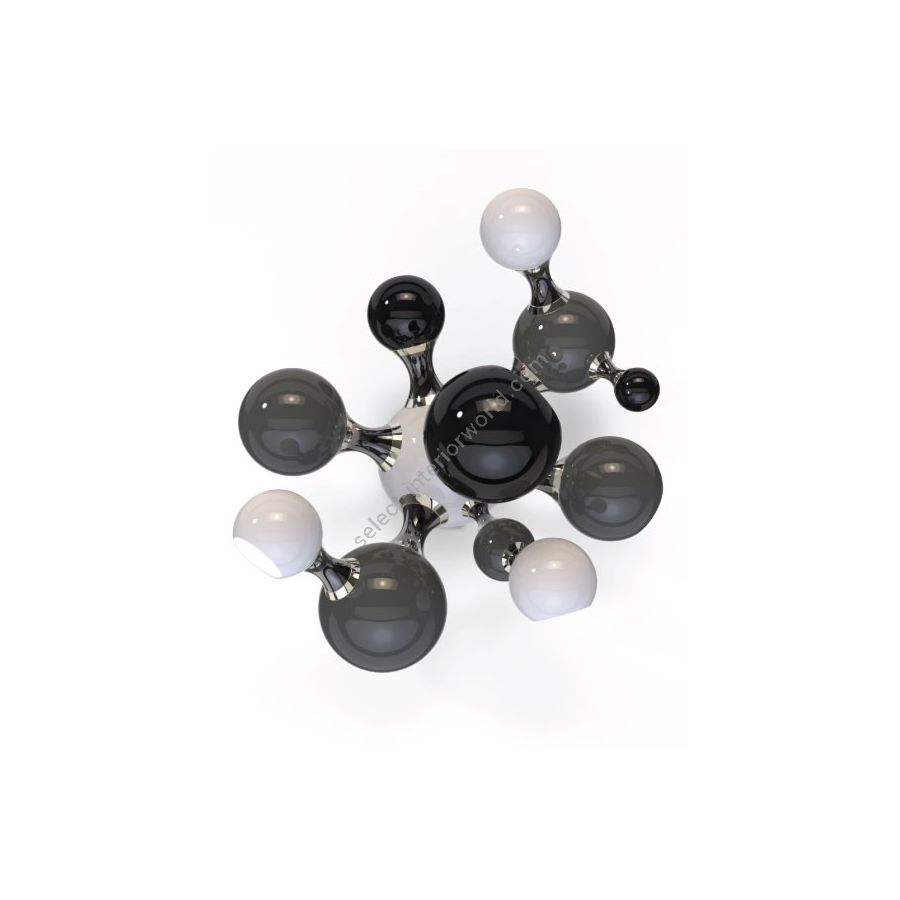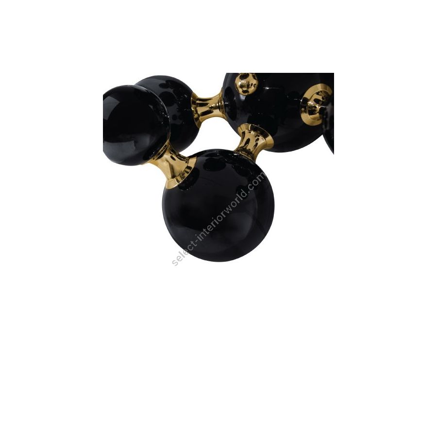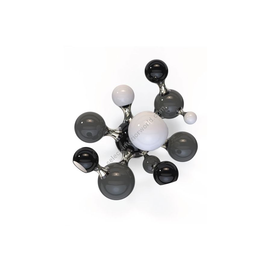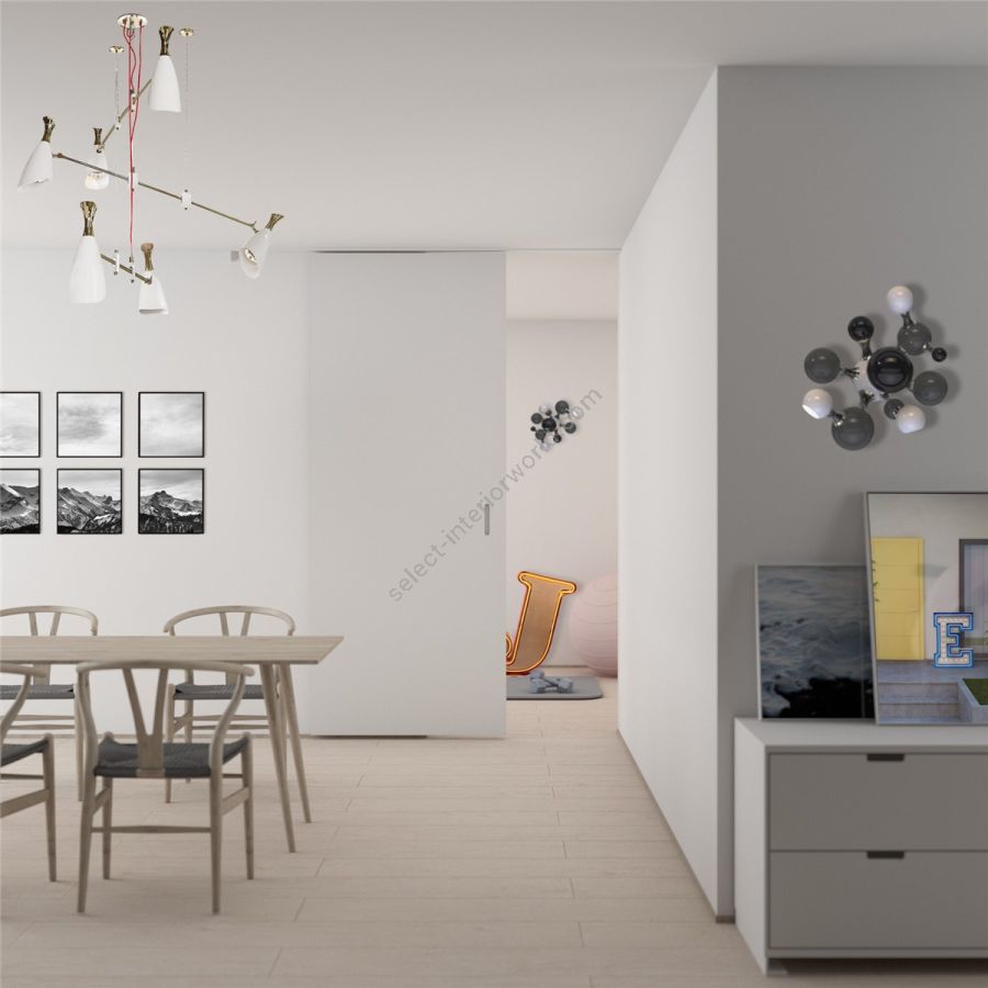 Atomic wall light is a mid-century modern lighting design inspired by the atomic discoveries of the mid-20th century. With multiple round shades that resemble the molecular composition of the atom, this interior wall light can give a fun twist to a contemporary home decor. Its body is handmade in brass and steel, with both a glossy black and a gold-plated finish. The lamp shades feature a glossy black lacquer on the exterior, while gold powder paint is used for the interior shade. It is with a modern vibe that this indoor wall light creates a statement of mid-century modern design in a contemporary living room, displaying each detail as a faithful reproduction of the glamorous 1950s.