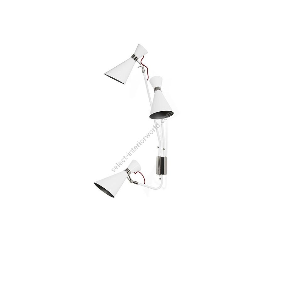 Simone wall lamp has a sleek, utilitarian design that brings a vintage flair to mid-century modern interiors. With a glossy white shade and a textile red wire, the vintage wall light fits in with a wide array of color schemes and styles. The three fully flexible arms are made of aluminum and the structure in brass, boasting three cone lampshades with gold plated accents. This mid-century modern sconce is easily changeable when in need of a reading light, especially as a bedside lamp, or if you are simply looking to light up your hallway.