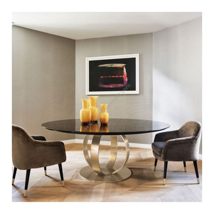 The Andrew dining table is a sculptural table. Its distinctive feature is the metal base, made by several curved components that perfectly blend together to create a single element of satin brass, glossy brass, bronze or chrome. Andrew takes the scene with majesty and self-confidence. А round top and in various and precious finishes, such as marble, macassar ebony, lacquered wood and glass, attaches itself to its metal structure with a perfect support. The choice of glass makes Andrew a real work of art: thanks to its transparency allows a complete view of the metal base underneath the top. Making himself the leading protagonist of every environment.