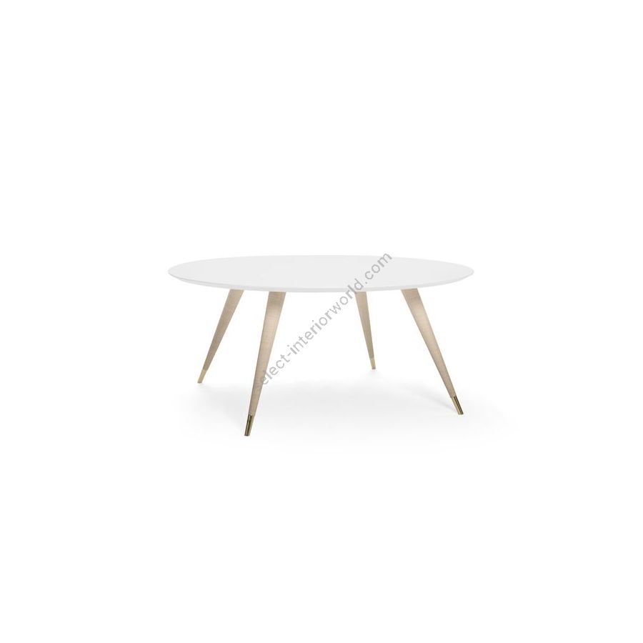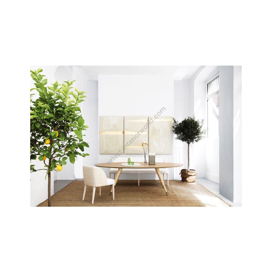 A family of dinner tables, tea tables, coffee tables, bar tables and gueridon ones. Cupertino animates the dialogue that the oak of the tops, natural or stained or lacquered, establishes with the raffia that wraps around the legs as well as with the metals of the tips. In the different versions, with an elliptical or a round beveled top – there is a strong variability in size, but also in personality. Similar to elegant shoes to choose for the evening, the metal tips are available in all DOM Edizioni metal finishes: from sharp and floating chrome to the roughest bronze, passing through the gloss or satin brass.
