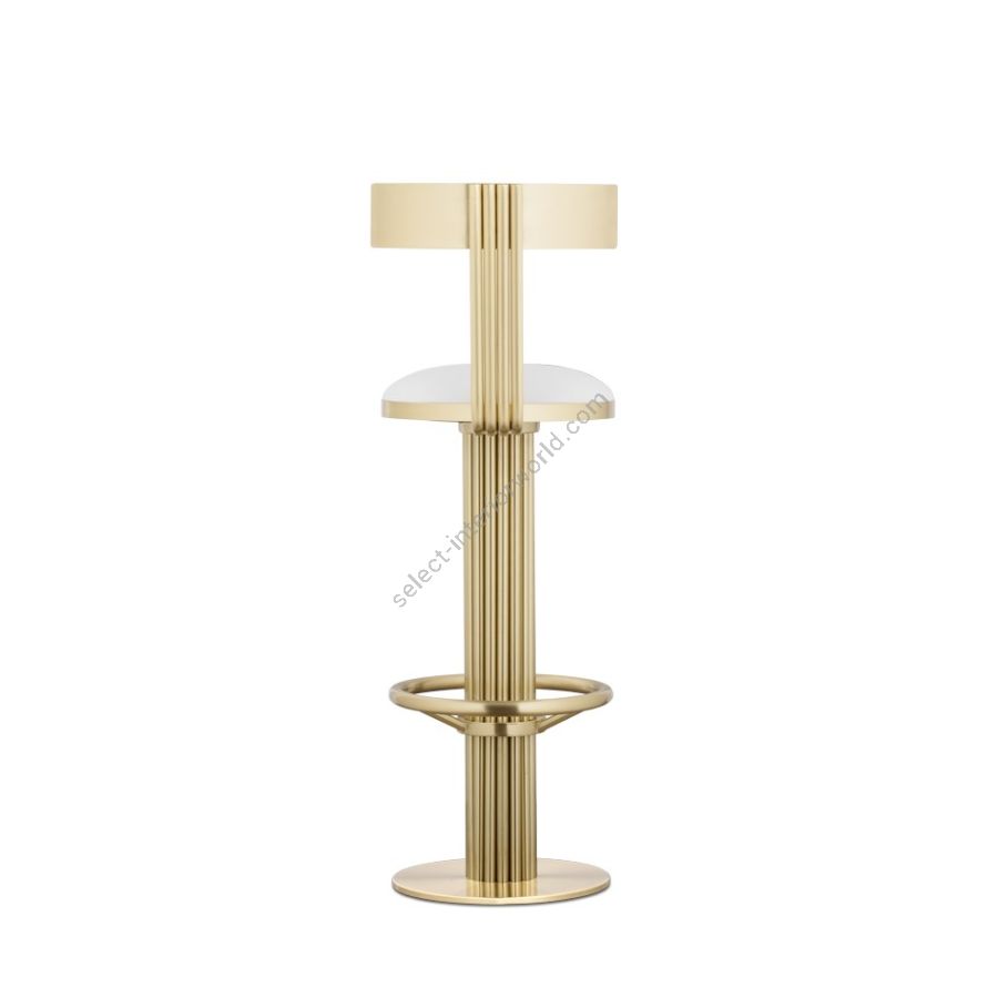 Inspired by the sculpted arches from the bar in the classic movie Casablanca, it's a timeless and unforgettable piece. Besides being stylish, it is made to be comfortable and stand the test of time. The body is a full piece of polished brass that features a low back, a foot rail, and white leather on the seat.