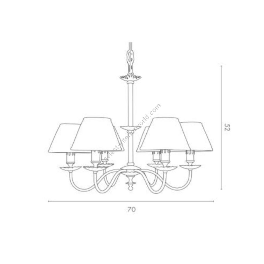 Chandelier with six lights in aged brass with fabric lamp shades.
