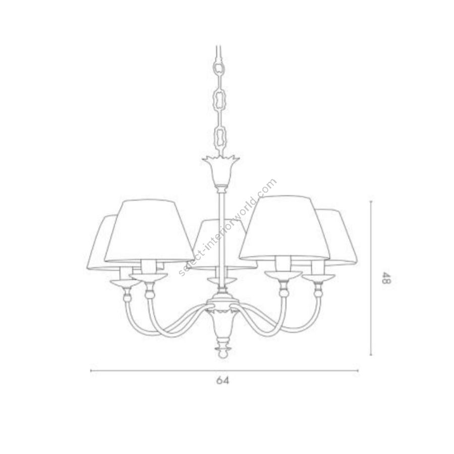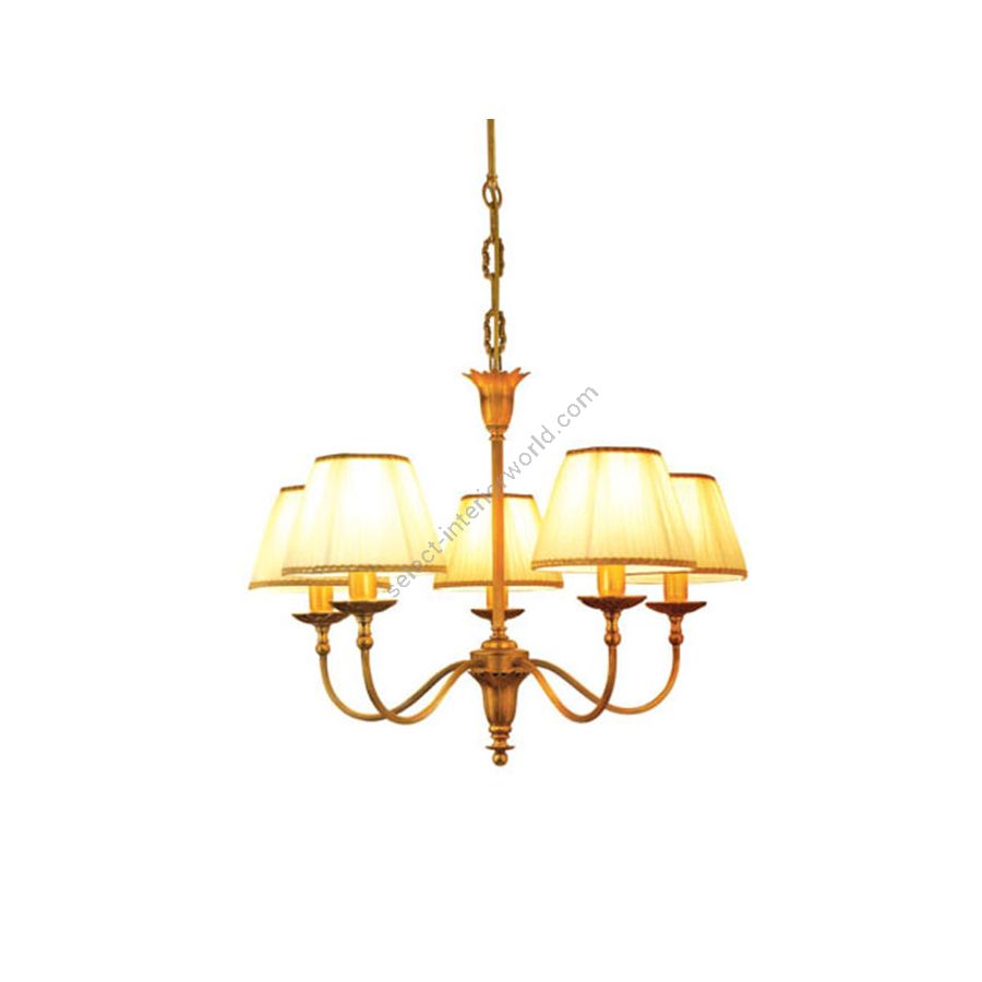 Chandelier with five lights in aged brass, fabric lamp shades.