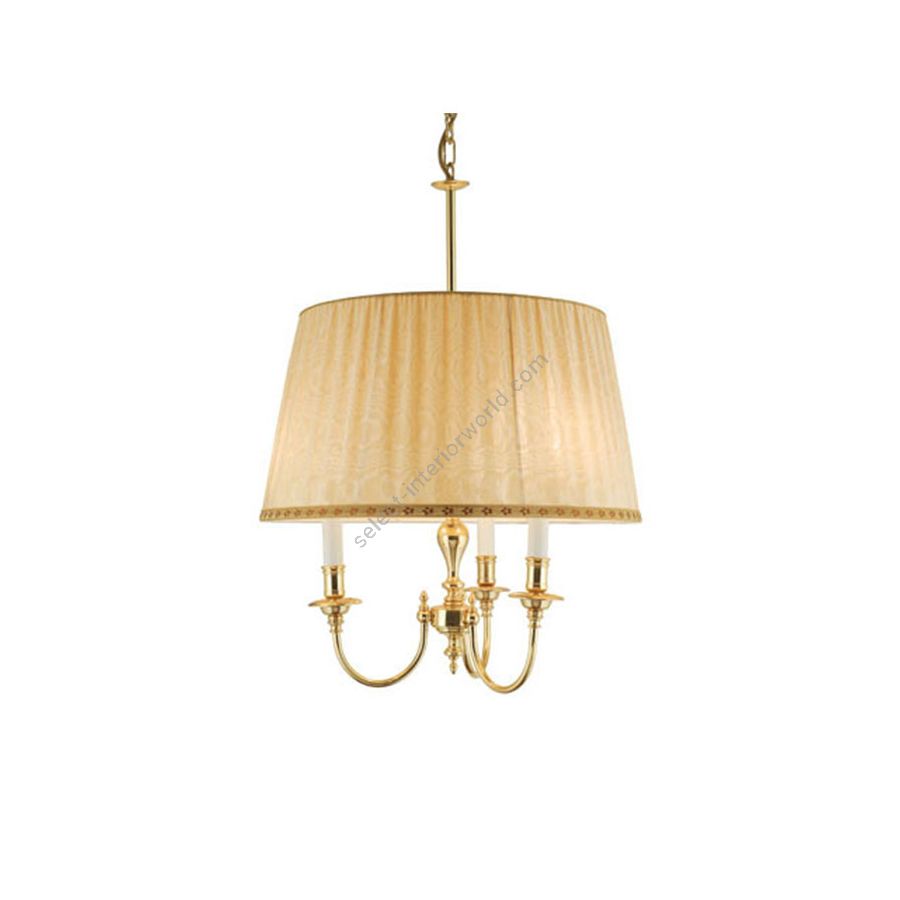 Chandelier with three lights in polished brass, fabric lamp shade.