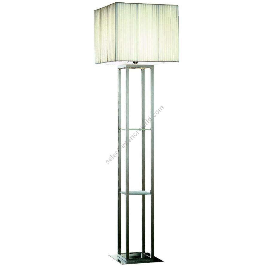 Floor lamp in chrome-plated brass, with two etched glass shelves. Fabric lampshade.