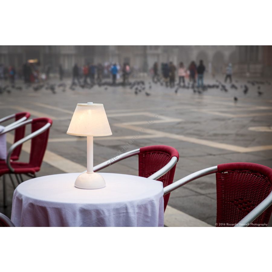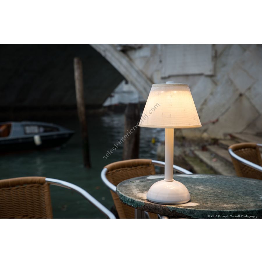 MOON cordless table lamp with base and stem in brass sheet lacquered in various finishes and colours. Conical lampshade Ø18 cm in various fabrics. For indoor and outdoor use. No water resistant. Rechargeable battery autonomy 8 hours.