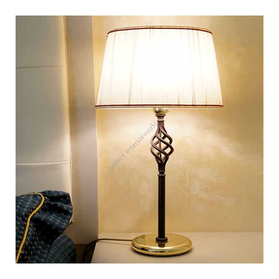 Table lamp in polished brass with stem in decorated metals, fabric lamp shade.