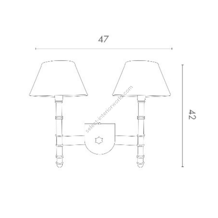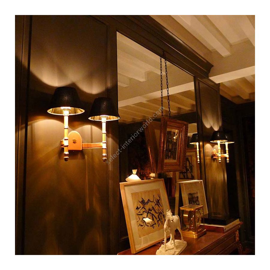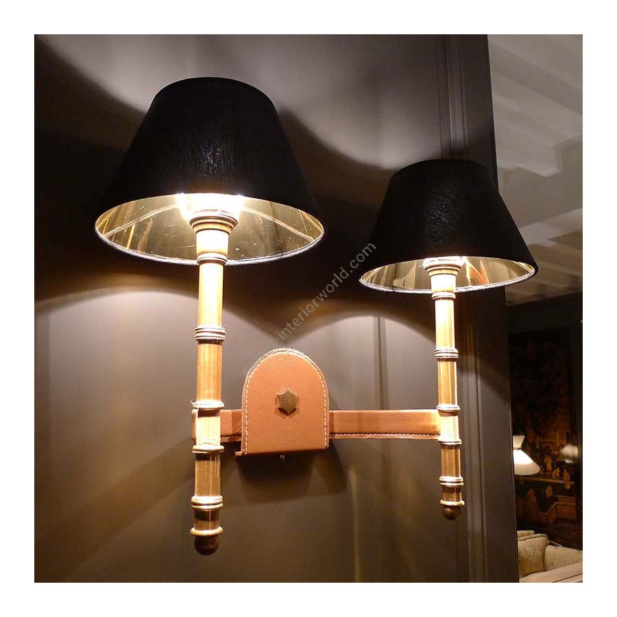 Lamp for wall installation mounting bracket for fixing at wall. Double arms structure in brass and metal with leather details and fabric lampshades.
