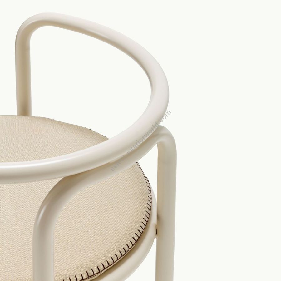 Il telaio di Locus Solus Chair è composto da tubolari in acciaio inossidabile verniciati. Questa capsule collection propone una struttura metallica Off-White con le sedute disponibili in due versioni: a strisce gialle o in tessuto beige con ricami fatti a mano a contrasto.