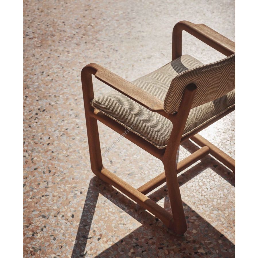 Modellata a mano con particolare attenzione al comfort e alla qualità delle finiture. La struttura in mogano è levigata e assemblata con estrema cura, mentre il rivestimento—realizzato con i tessuti outdoor esclusivi di Loro Piana—viene applicato con precisione sartoriale. Il risultato è un pezzo che unisce la maestria della falegnameria tradizionale all’eleganza dell’eccellenza tessile.