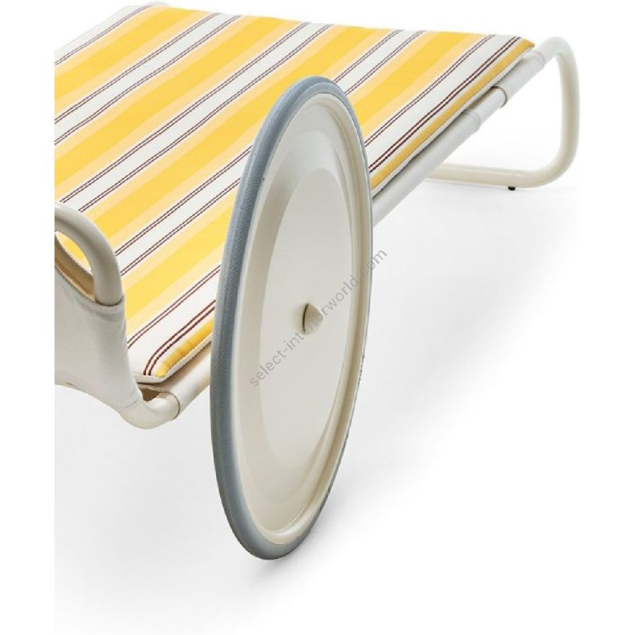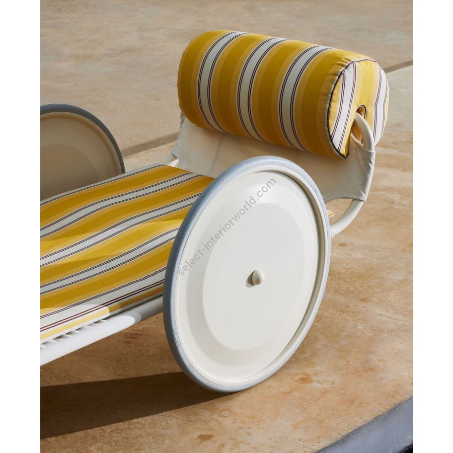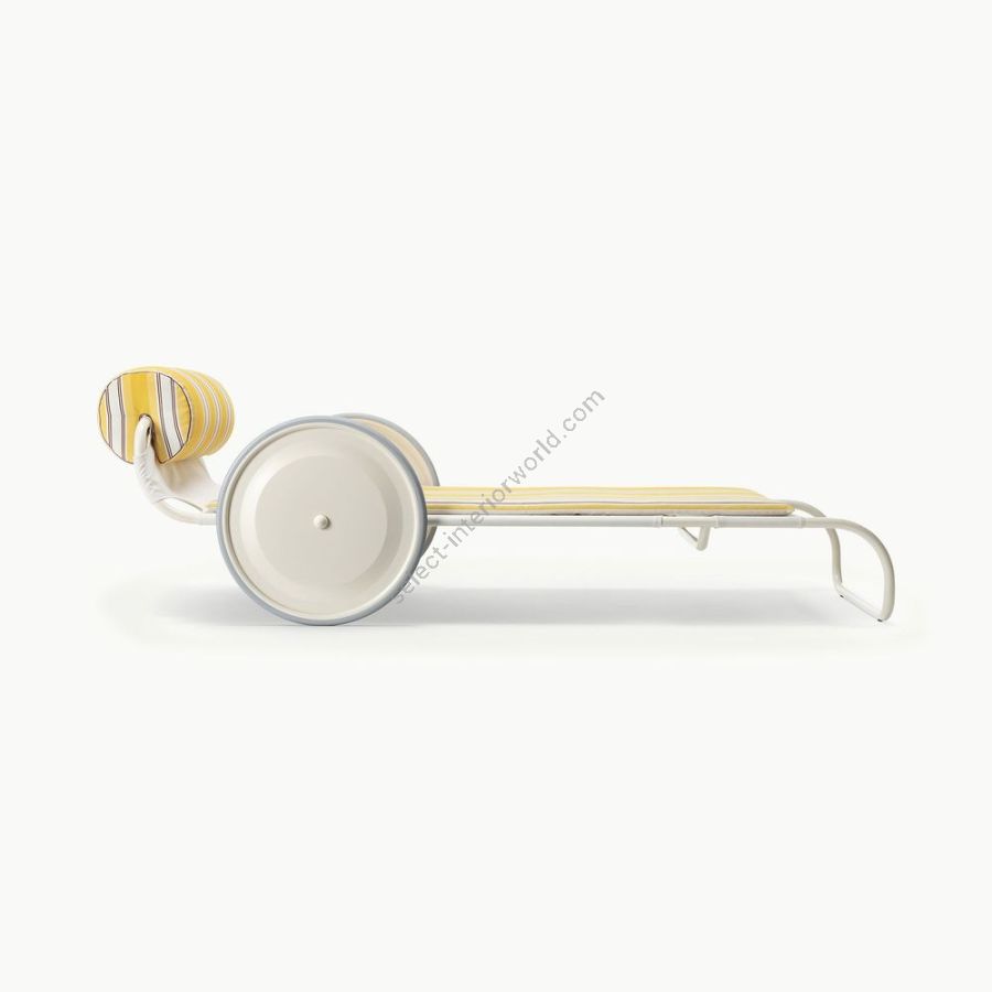 Relax e stile si incontrano dando vita a volumi circolari con esiti affatto scontati. Il tratto distintivo di questo lettino prendisole sono le due grandi ruote verniciate ai lati, elementi originali che consentono uno spostamento agevole.