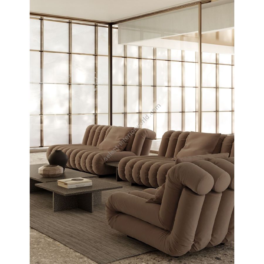 Disponibile anche nella versione Arc Coffee Table, un tavolino dai caratteristici volumi curvi che s'inseriscono con originalità tra gli imbottiti della linea Periscopio.