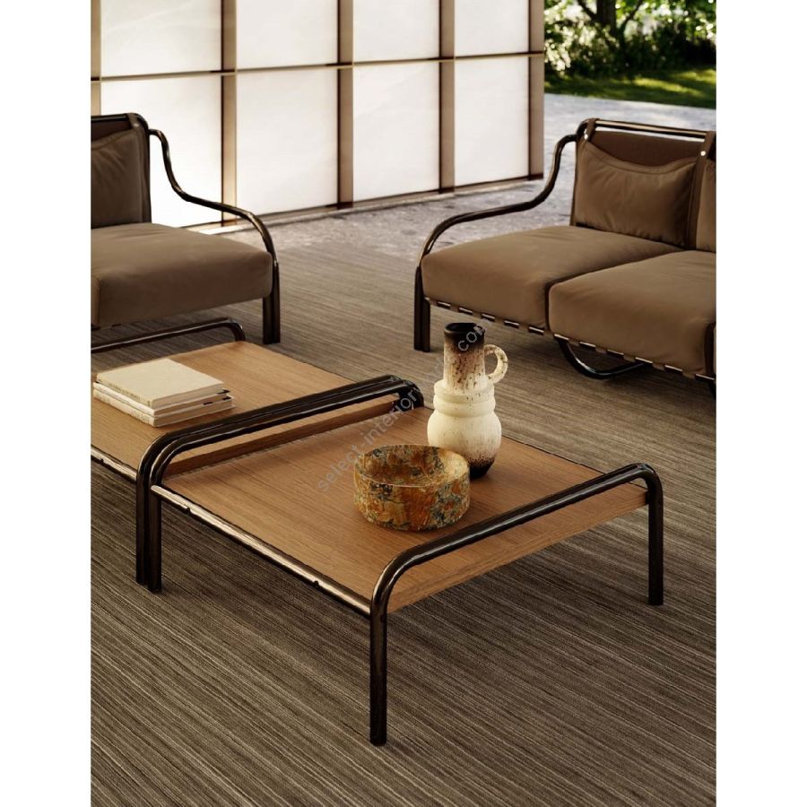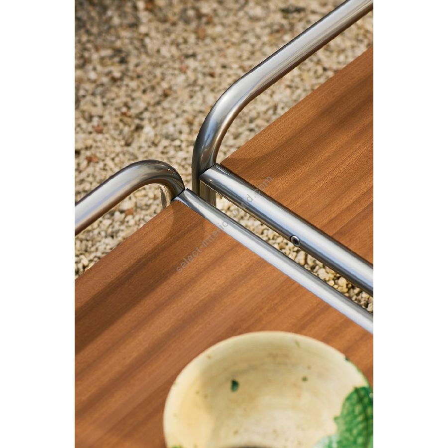 Come le sedute dell'omonima collezione, anche questo tavolino ha una struttura tubolare in acciaio inox che sostiene un ampio piano in mogano.