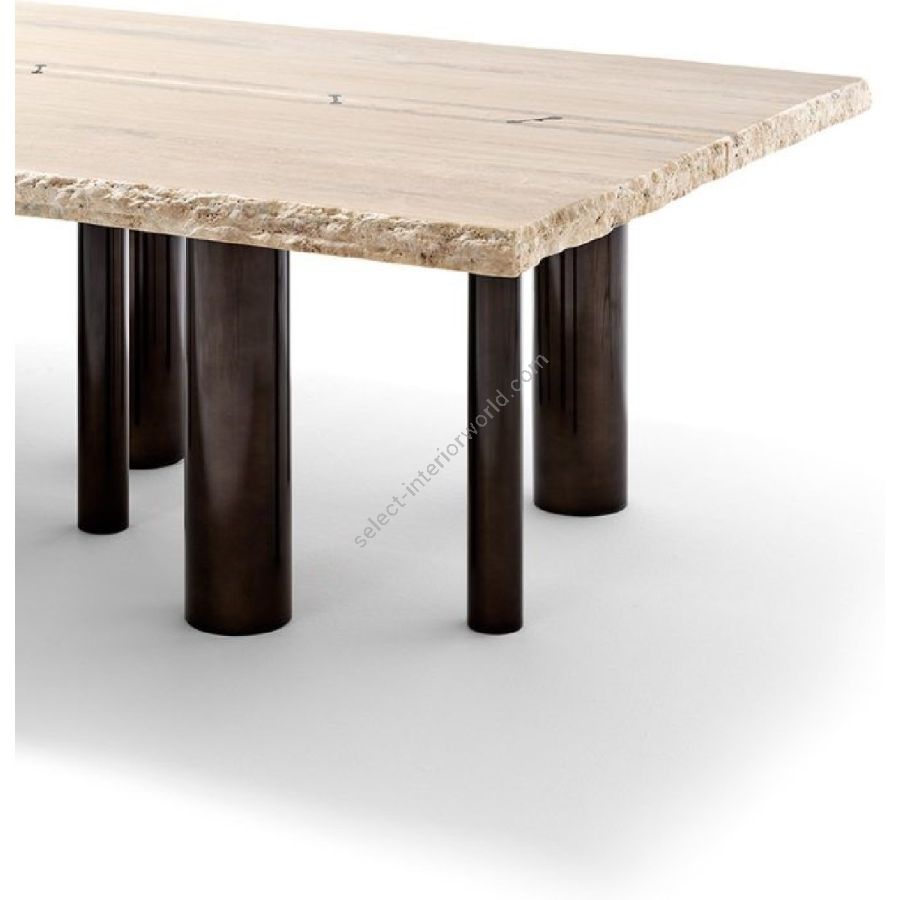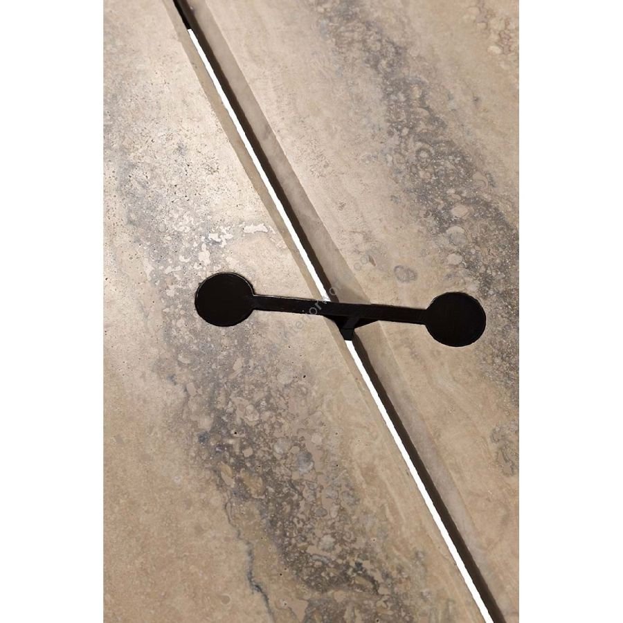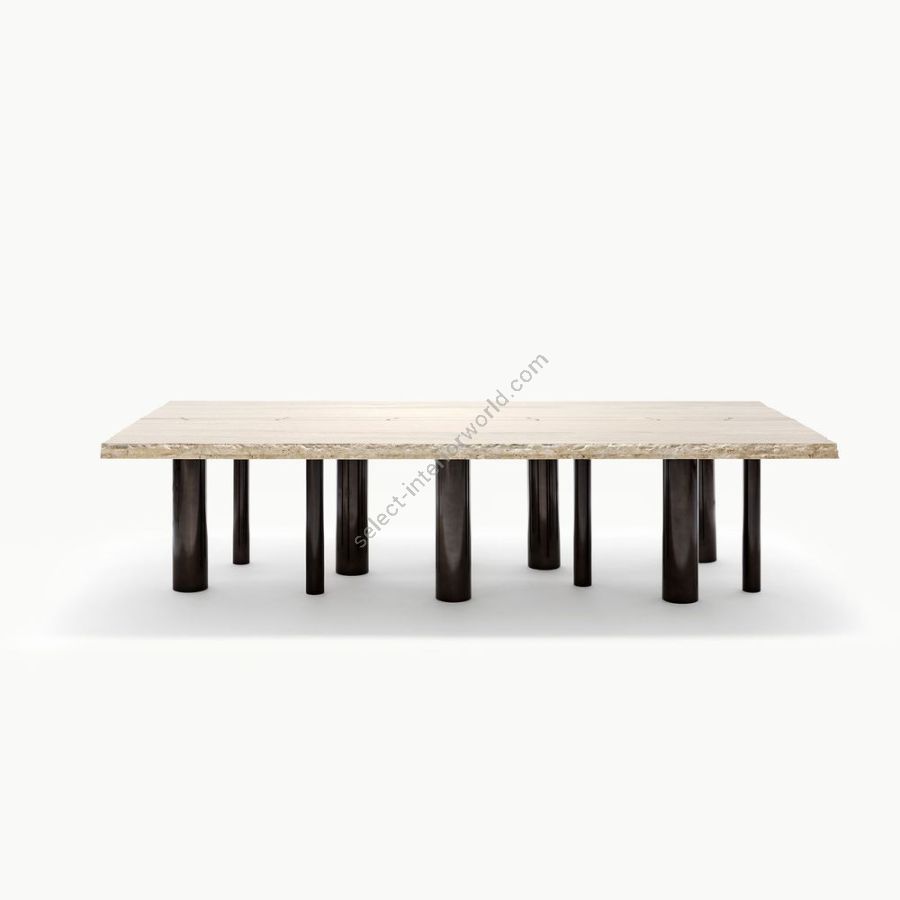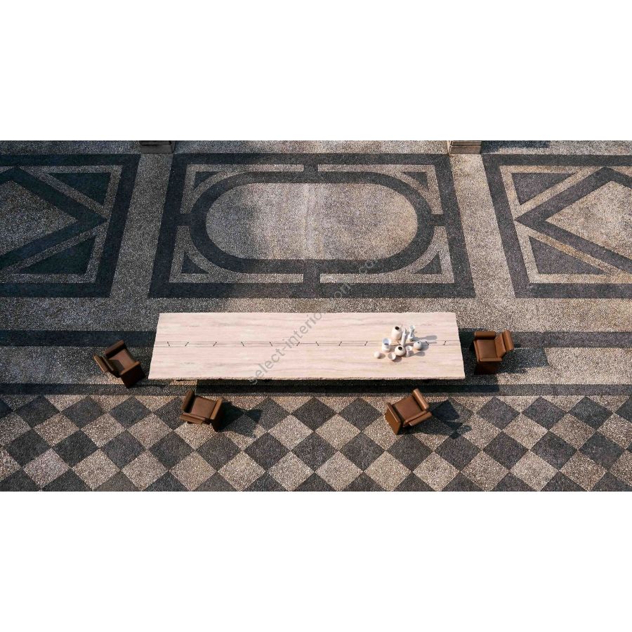 The 10th Joint Stone Dining Table blends stone and steel in perfect harmony. The sculptural legs, featuring different diameters, support the imposing tabletop, combining solidity with refined design. A piece where natural veining and technical precision meet to create timeless outdoor elegance.