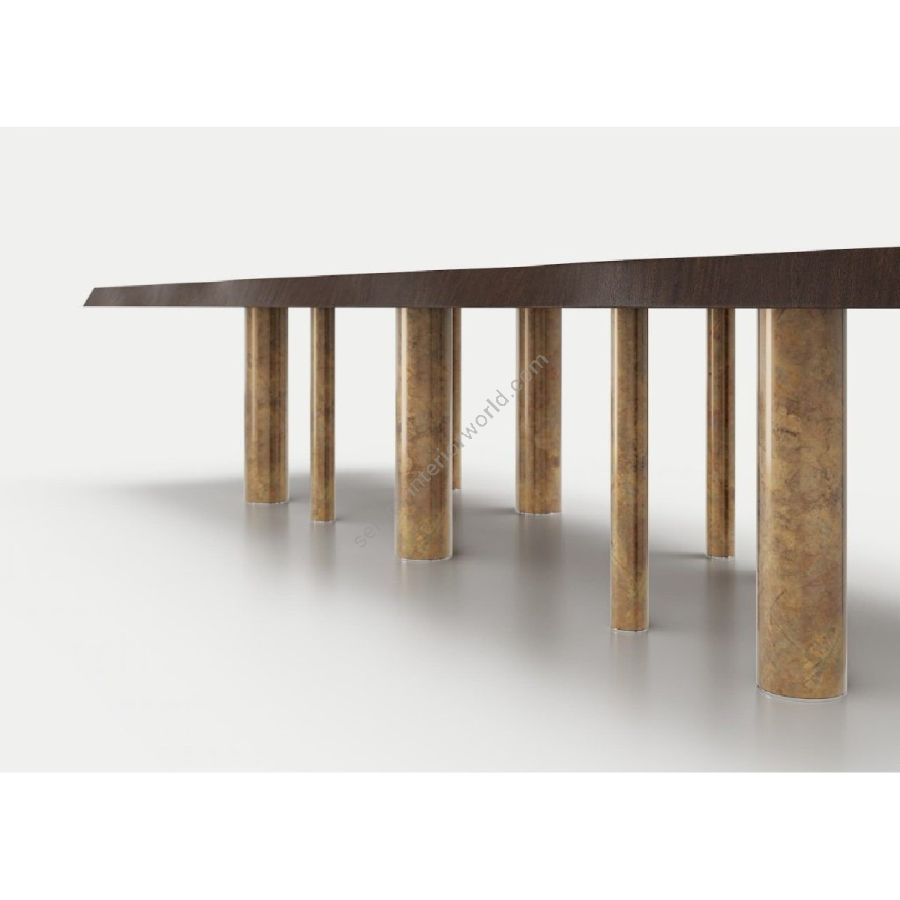 Le basi in ottone brunito, dai differenti diametri, si susseguono in modo asimmetrico sostenendo il possente piano del tavolo.