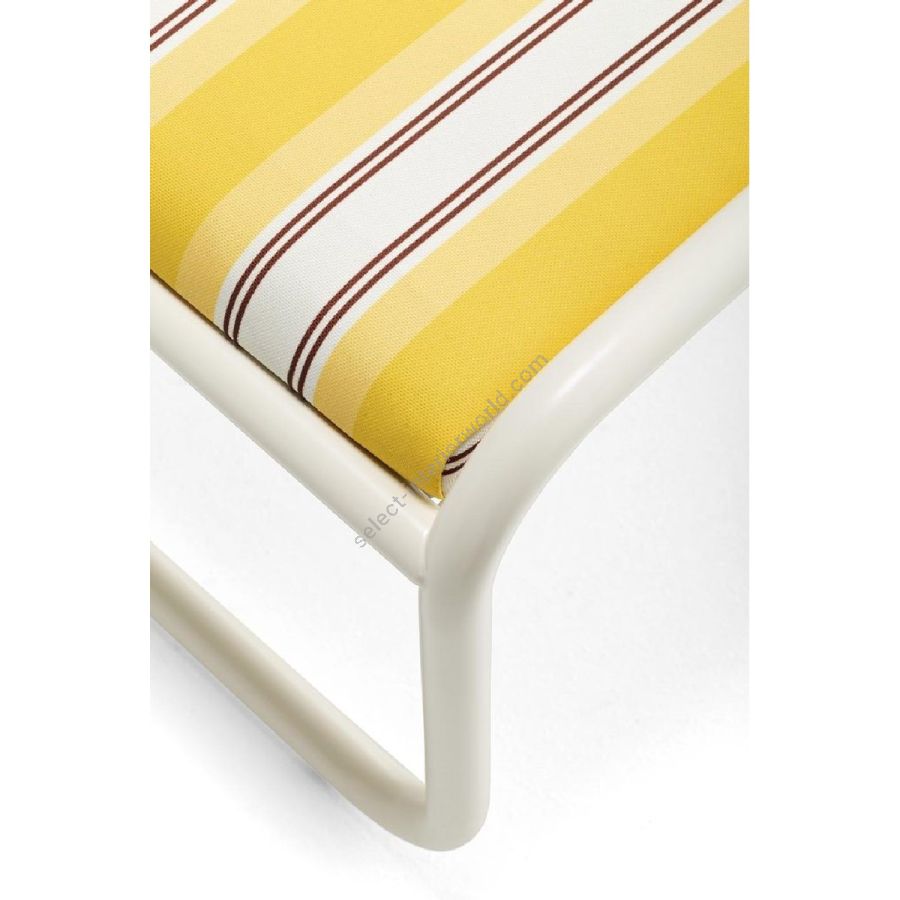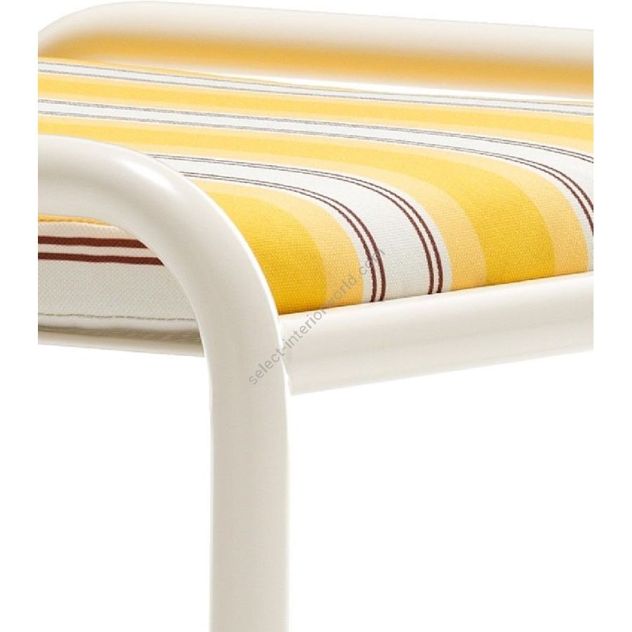 Il telaio di Locus Solus Pouf è composto da tubolari in acciaio inossidabile verniciati. Questa capsule collection propone una struttura metallica Off-White con le sedute disponibili in due versioni: a strisce gialle o in tessuto beige con ricami fatti a mano a contrasto.
